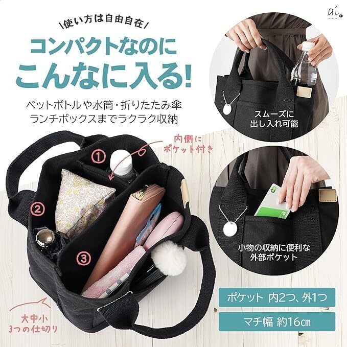 • 【大容量収納!3つの仕切りで整理整頓】 コンパクトな見た目以上の収納力!内部の仕切りは持ち物を整理整頓でき、中身が見やすくどんな場面でも快適にお使いいただけます。500mlのペットボトルや水筒、折りたたみ傘、長財布など、外出時に必要な物をまとめて持ち運べる大容量収納!マチ幅を広く設計したことで、大きめのポーチやランチボックスも収納できるので、用途にあわせて使い方は自由自在! また、内外部に付いた3つのポケットには、スマホやエコバッグなどの小物類、ICカードや鍵などすぐに取出したいものを入れておくと便利です。