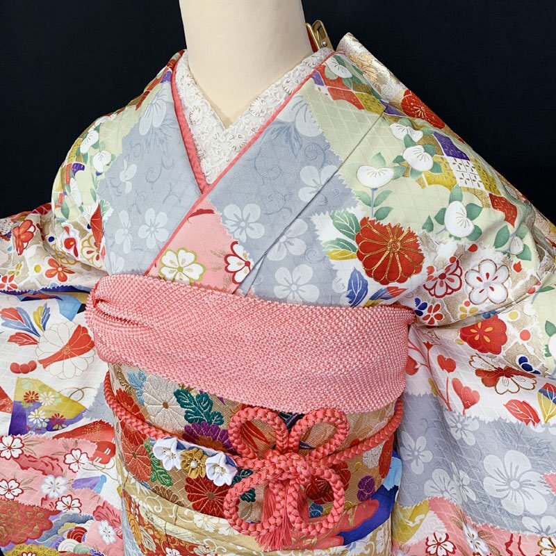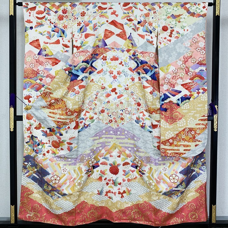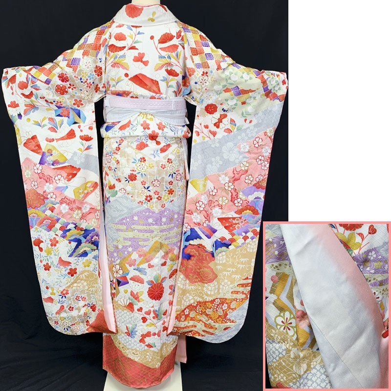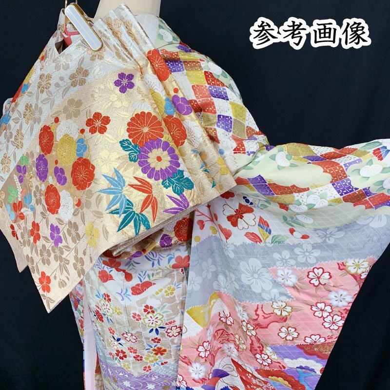 ☆振袖 総柄 小柄な方にも 金駒刺繍 金彩 松菱 カラフル☆美品 成人式 結婚式 (No.gd) 白地にくすみピンクや青紫・朱色や辛子色など色とりどりな寄せ柄が染められた、可愛らしい総柄の振袖です。地は細かな菱繋ぎ地紋が浮かび上がり、柄には金彩や金駒刺繍が施されています。 こちらの商品は振袖のみで、画像の袋帯309y16、重ね衿、帯締め、帯揚げは参考商品ですが、在庫がある場合に限り+16,000円で振袖とセットでお譲りすること可能です。半衿と帯締めについているつまみ細工は私物のためお譲りいたしかねます。草履バッグセット406v35は参考商品です。 画像5枚目のように衿山と袖口に使用汚れ、脇に若干ほつれや擦れがございます。また若干保管臭がございますが、特に目立つようなシミ・ダメージはなく美品です。 【表地素材】正絹 【色】オフホワイト、カラフル *モニターによって色味は実際と異なる場合がございます。 【サイズ】