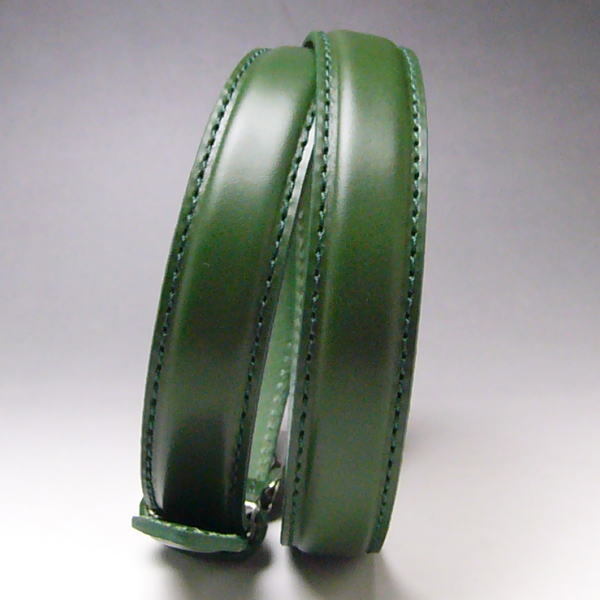 1枚のレザーを銀面と床革に割いて芯材を入れ、両サイドをギュッと大きめなステッチで縫い合わせることで厚みをプラス! 強度が上がるのはもちろんこと、見た目にも立体感がうまれ高級な雰囲気の一本に仕上がっています。一枚革から作られているから表も裏も勿論姫路レザーです。