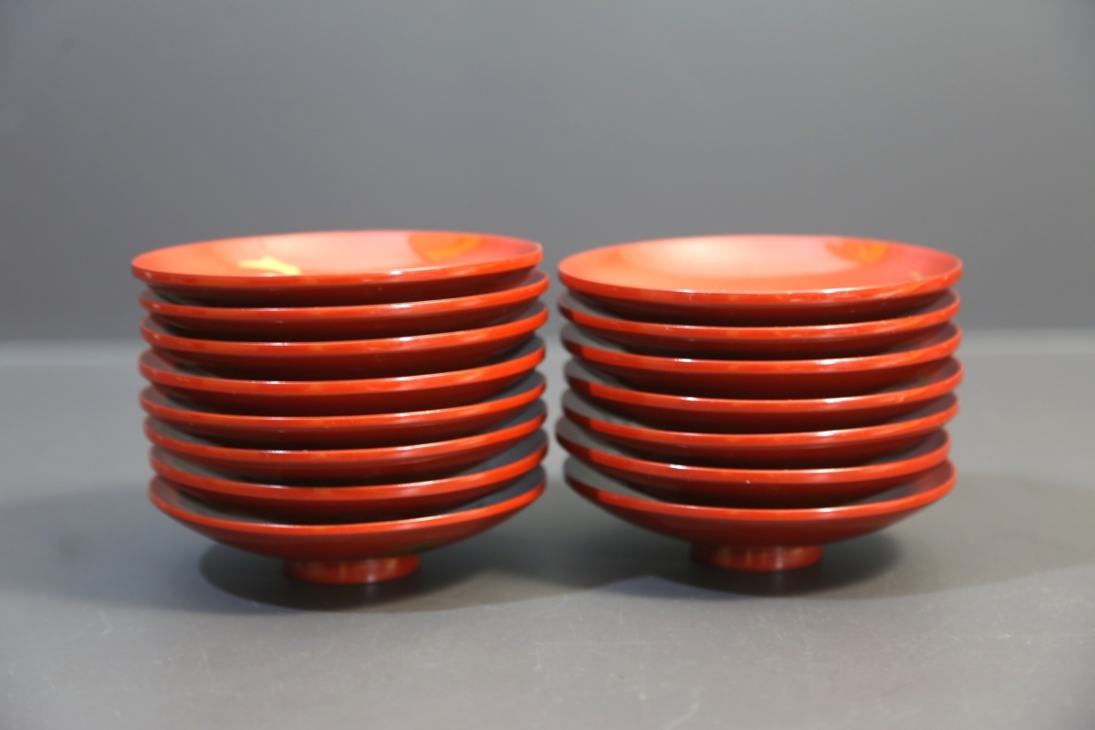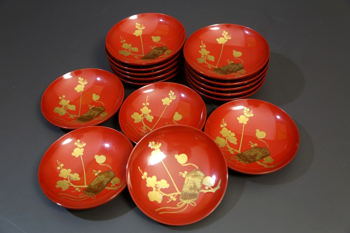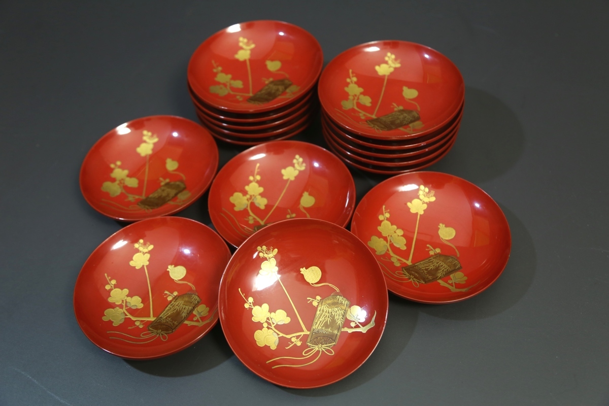 ★★★ 明治期 木製 朱塗り 梅に印籠蒔絵 裏に蝶蒔絵 引き盃 15客 ★★★