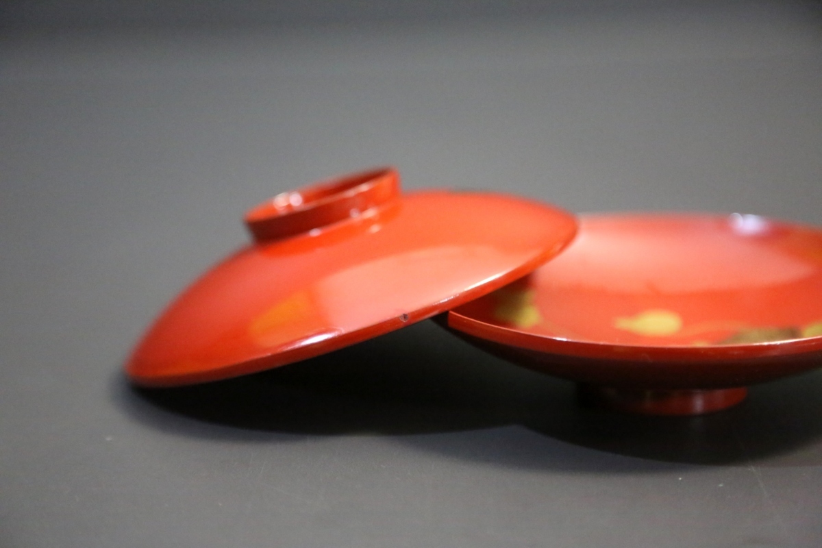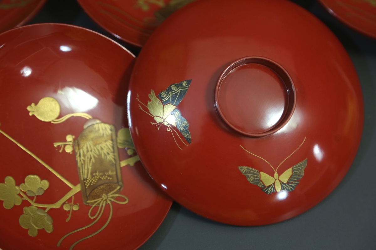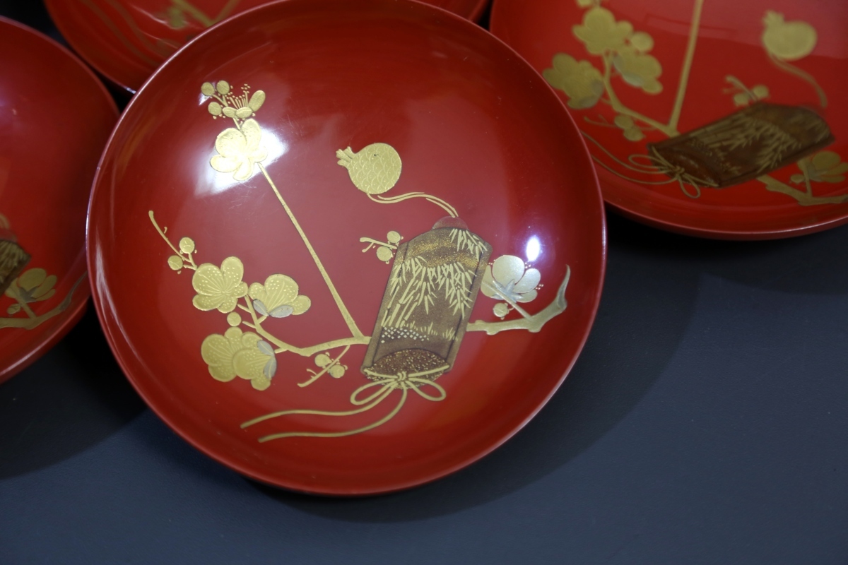 ★★★ 明治期 木製 朱塗り 梅に印籠蒔絵 裏に蝶蒔絵 引き盃 15客 ★★★ 56