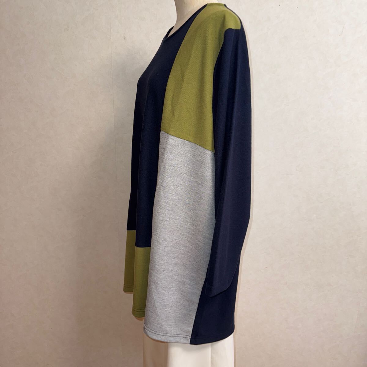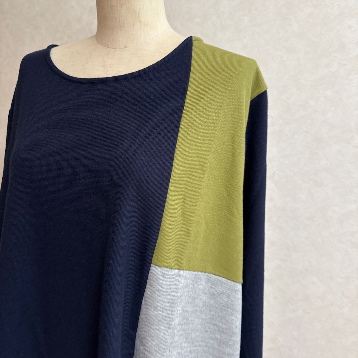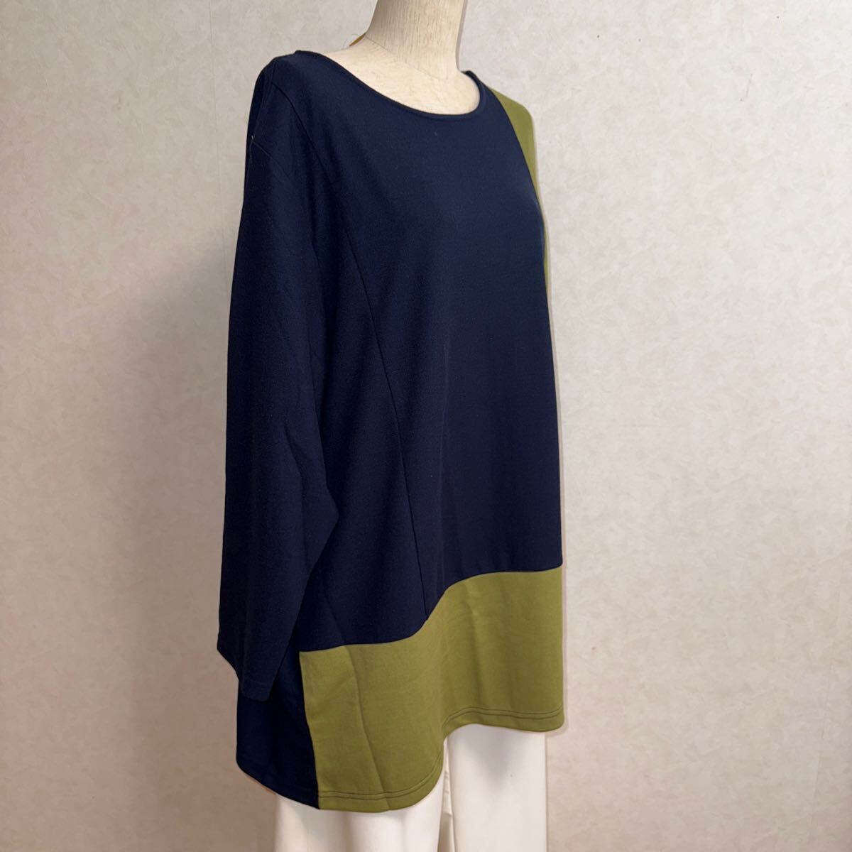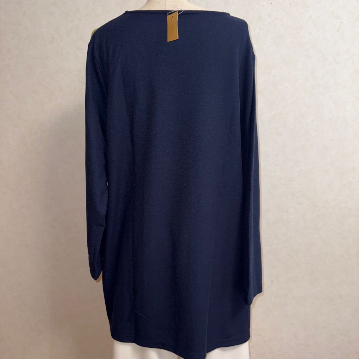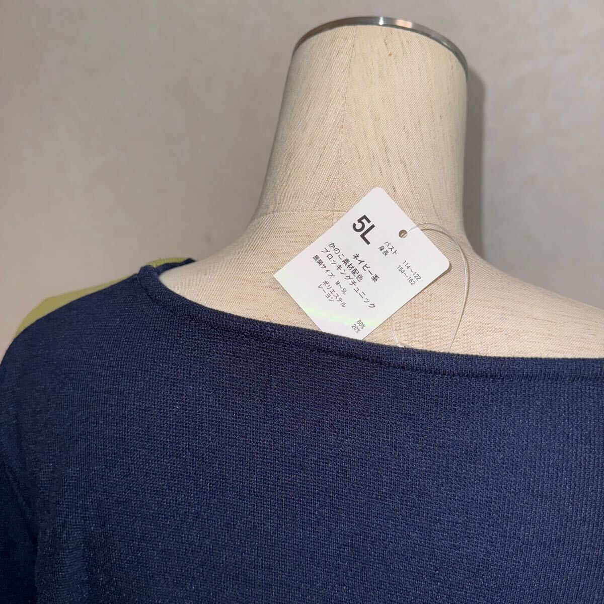 KN3055 *5L 大きいサイズ 鹿の子素材、配色ブロッキングチュニックネイビー系