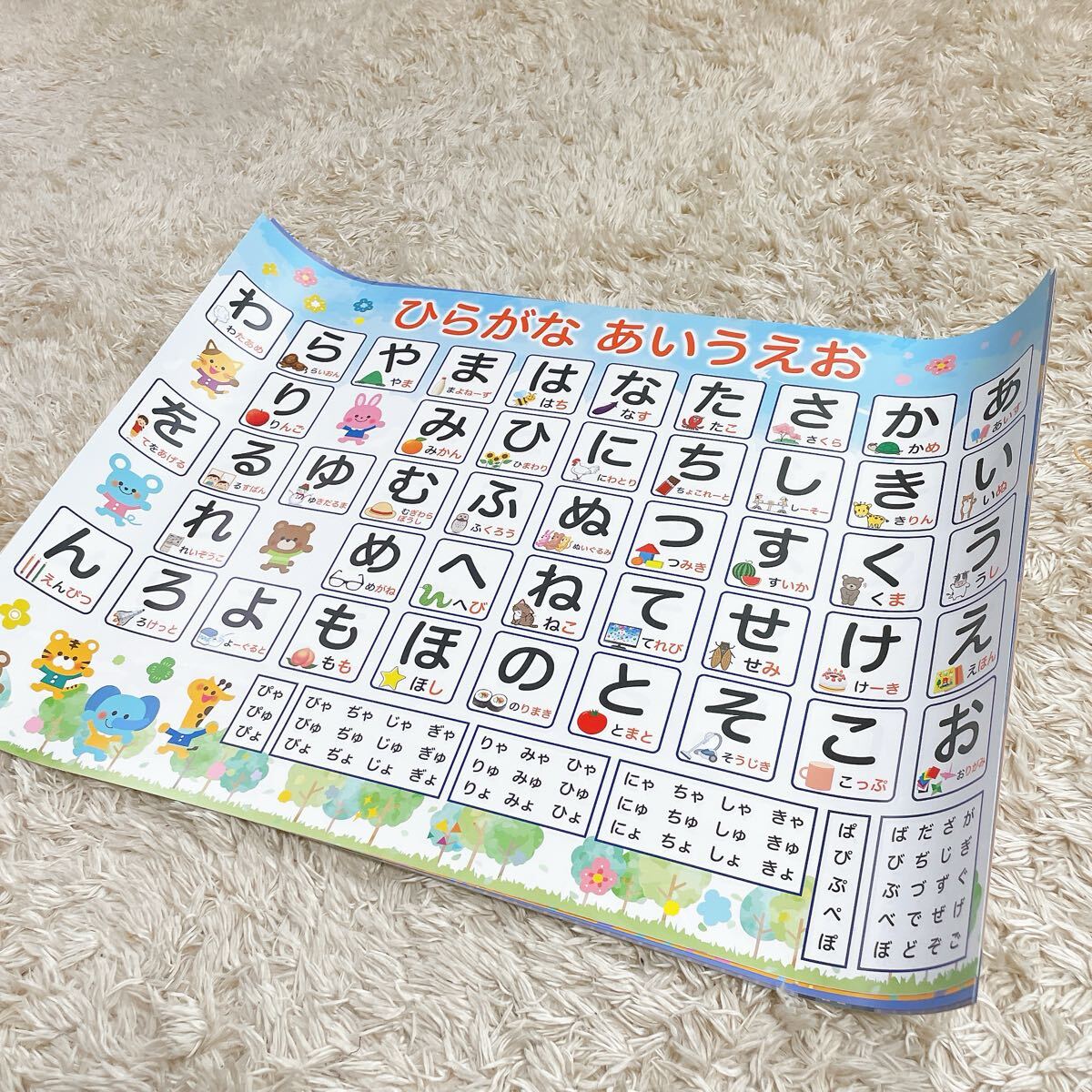 「多種多様な文字、イラスト」ひらがな・カタカナ・濁点・半濁点・単語・イラストも描かれていて、イラストからお子様が興味を持って覚えていただけるようにしました。