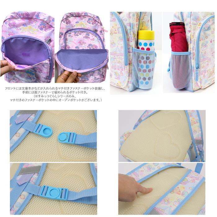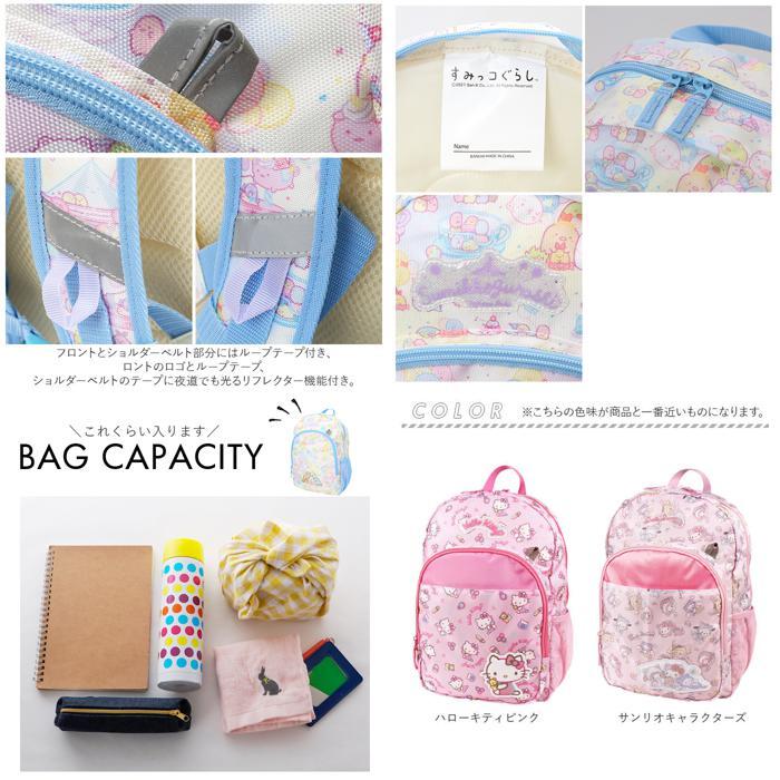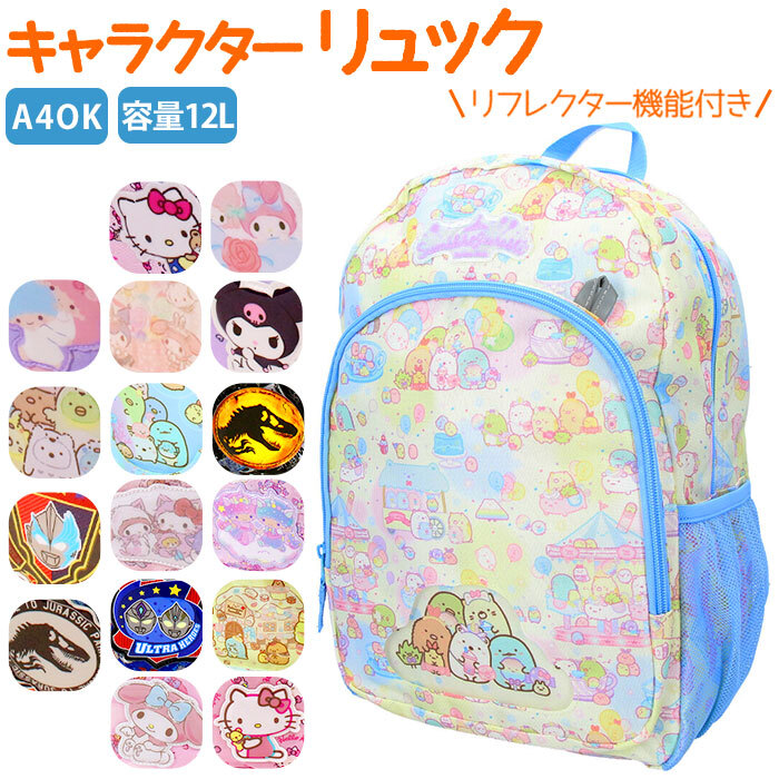 商品説明 | ・・キャラクターデザインが可愛い荷物がたくさん入るキッズリュックのLサイズが登場。 ・容量は約12LでA4サイズ対応のメインルーム♪ノートや600mlの水筒が縦に入る高さ! ・長ズボンや厚手の洋服も一枚ずつ入り、少し遠くのお出かけに便利。また、開口部はダブルファスナーで大きく開き、お弁当箱など出し入れやすいのが特徴! ・メインルーム内はオープンポケット×1と名前を記入できるネームタグ付き。 ・フロントには文庫本がなどが入れられるマチ付きファスナーポケット装備し、手前には面ファスナーで留められるポケット付き。(※すみっコぐらしシリーズのみマチ付きのファスナーポケットの中にオープンポケットがございます。) ・フロントとショルダーベルト部分にはループテープが付いており、防犯ブザーや目印になるキーホルダーの取り付けに最適。 ・さらにそれぞれキャラクターのワッペンが付いている特徴あるデザイン!(※すみっコぐらしシリーズのみ、クリア窓仕様です。) ・サイドに折りたたみ傘やウォーターボトルがちょこんとしまえるオープンポケット×2を配置。 ・さらにフロントのロゴとループテープ、ショルダーベルトのテープに夜道でも光るリフレクター機能付き。 ・背面とショルダーベルトは長時間背負っていても疲れにくく蒸れにくいクッション材が入ったメッシュ素材を採用。ショルダーベルトには、ズリ落ちを防ぐチェストベルト付き。 ・お出掛けやアウトドアイベントがもっと楽しくなる!男の子にも女の子にも人気のキャラクターデザインをラインナップ。 |