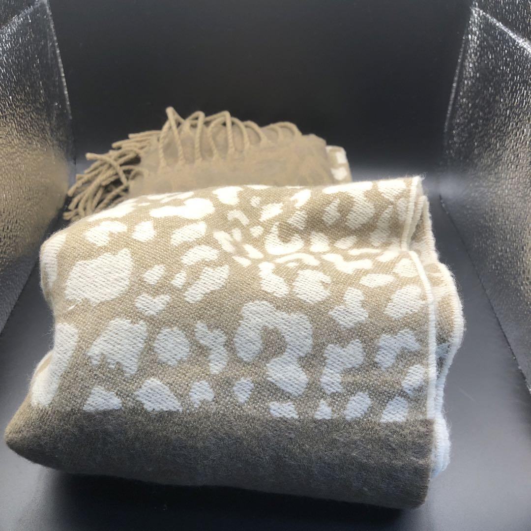 ヒョウ柄デザインのベージュストール、フリンジ付きでスタイリッシュ。