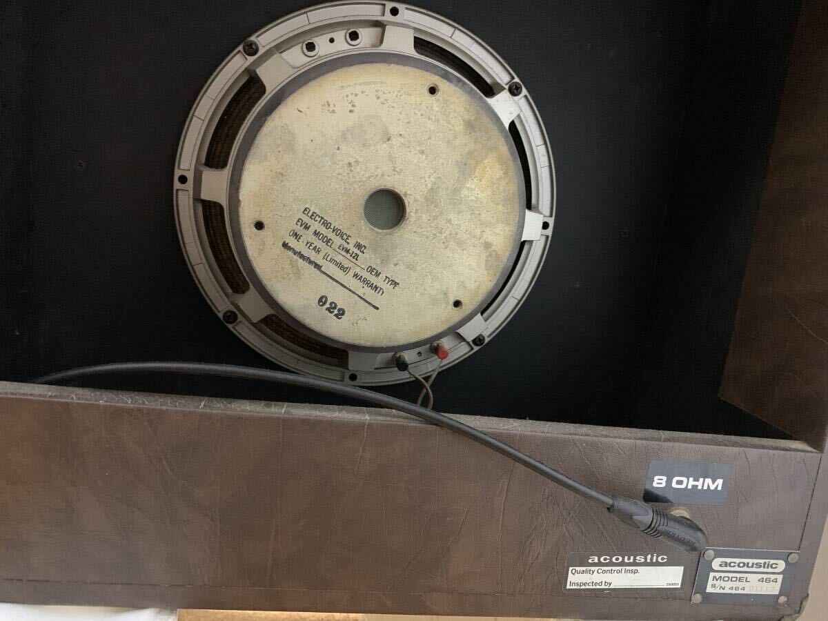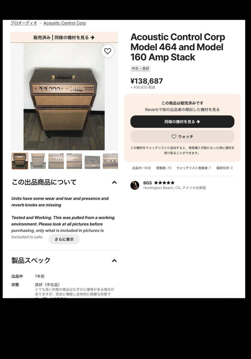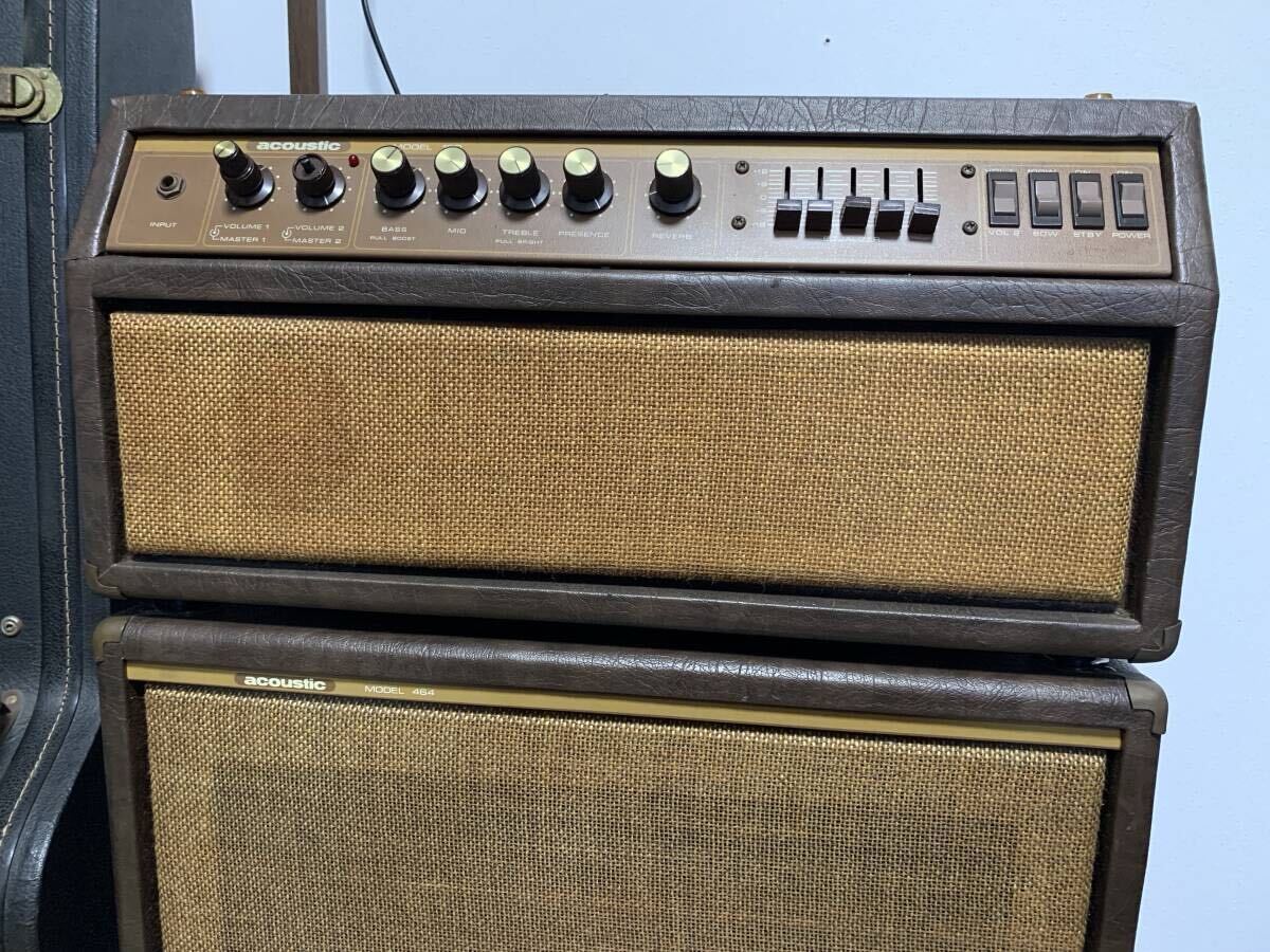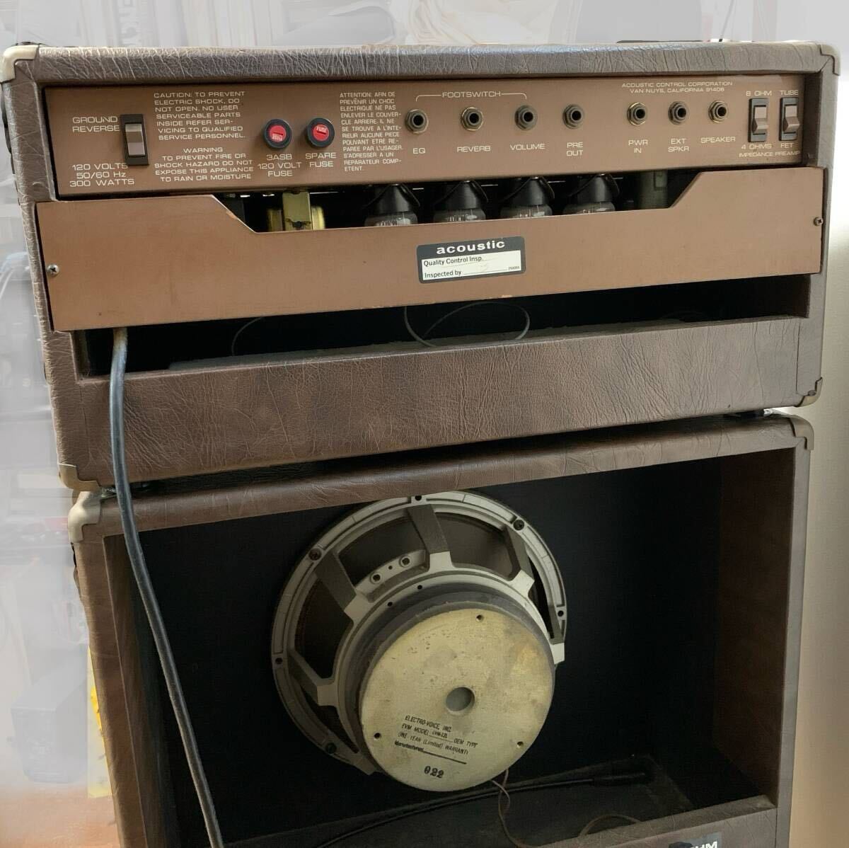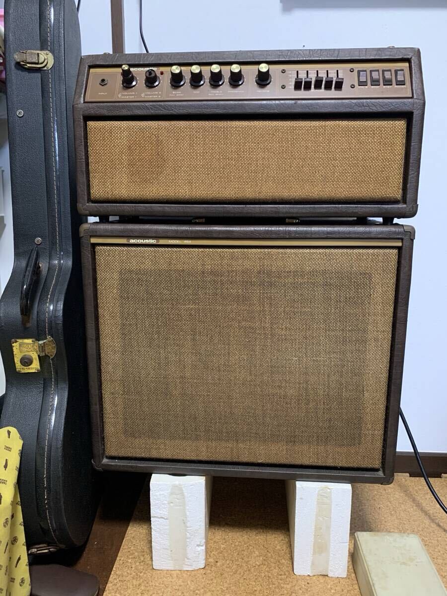 旧アコースティック社の貴重な真空管ギターアンプです。ジャズギタリストの高内春彦氏がAcoustic社に特注してチューニングしたユニットで本人より譲り受けたものです。ジャズ、フュージョンにピッタリです。プリアンプは、真空管とFETが切りかえできます。ボリュームつまみが一つ欠損していますが、回せますので機能に問題ありません。最大出力は、100Wと60Wの切り替えができます。若いときに買って仕事が忙しくなってからは、使っていませんでした。年取って再開するつもりでしたが、既に指が動かず断念しましたのでお譲りすることにしました。普段は、小型の練習用アンプを使っていたのでこちらは、ステージにて何度か使用した程度であまり使っていませんでした。経年劣化で皮持ち手の裂け、本体の傷や汚れはありますが、年代の割には綺麗な方だと思います。作りがしっかりしているので重量物ですがその分音がいいです。スピーカーは、エレクトロボイスです。アメリカでの中古価格が14万円程度なので安いと思います。元箱に入れて2個口にて発送します。一つにまとめると30kgを超えるため匿名配送は、ご利用になれません。1個は、宅急便で発送しますので落札後に配送先をお知らせください。