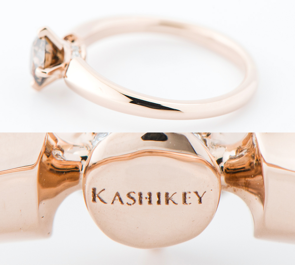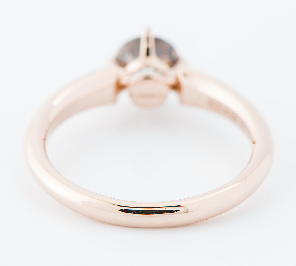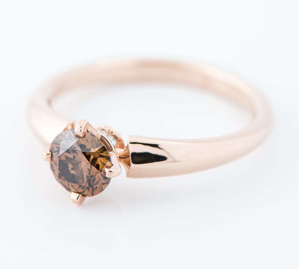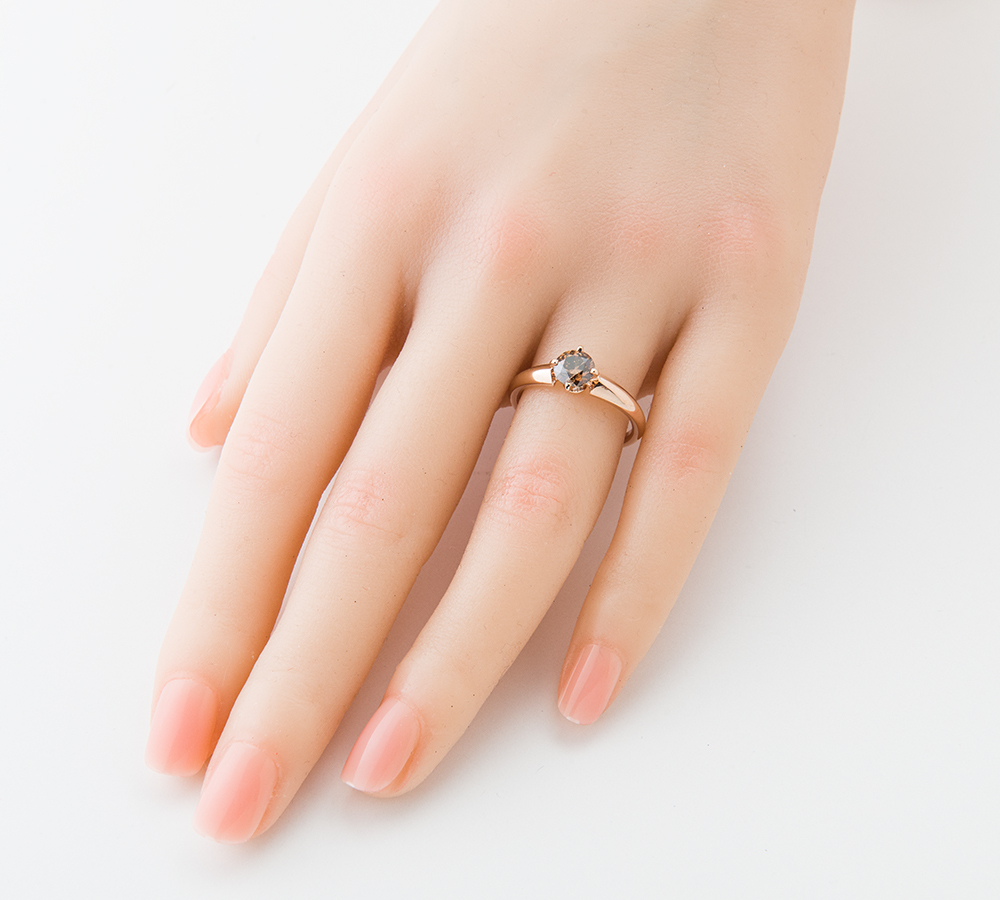 肌馴染みの良いオリジナルカラーゴールドに、ブラウンダイヤモンドが上品にマッチしたカシケイソリティアのリング。濃くクリアなブラウンカラーで0.75ctと大きく、無駄のないシンプルなアームとの組み合わせが落ち着きのある洗練された印象を与えます。内包物はありますが、ディープな色合いのためあまり目立たず、テリの良さが魅力的です。メレダイヤモンドを石座部分にセットした、細部にまでこだわり抜いたシンプルなデザイン。ブラウンダイヤモンドの煌めきが存在感を放つ気品溢れるジュエリーです。