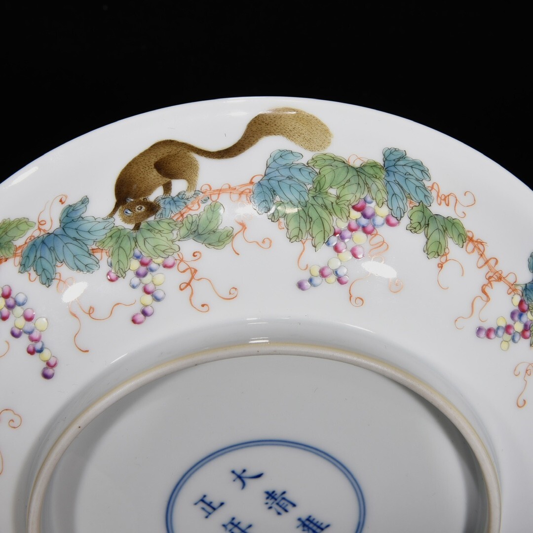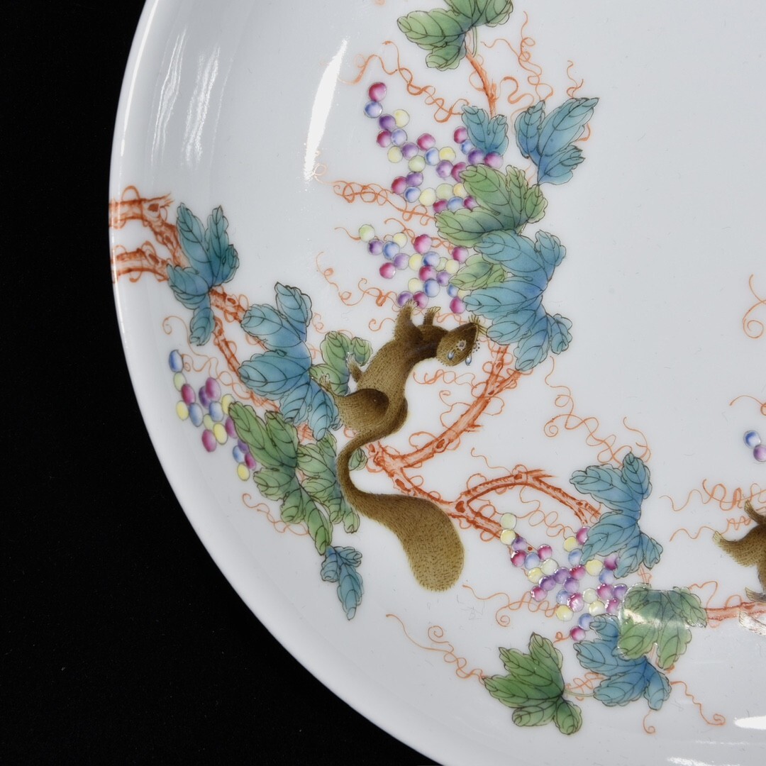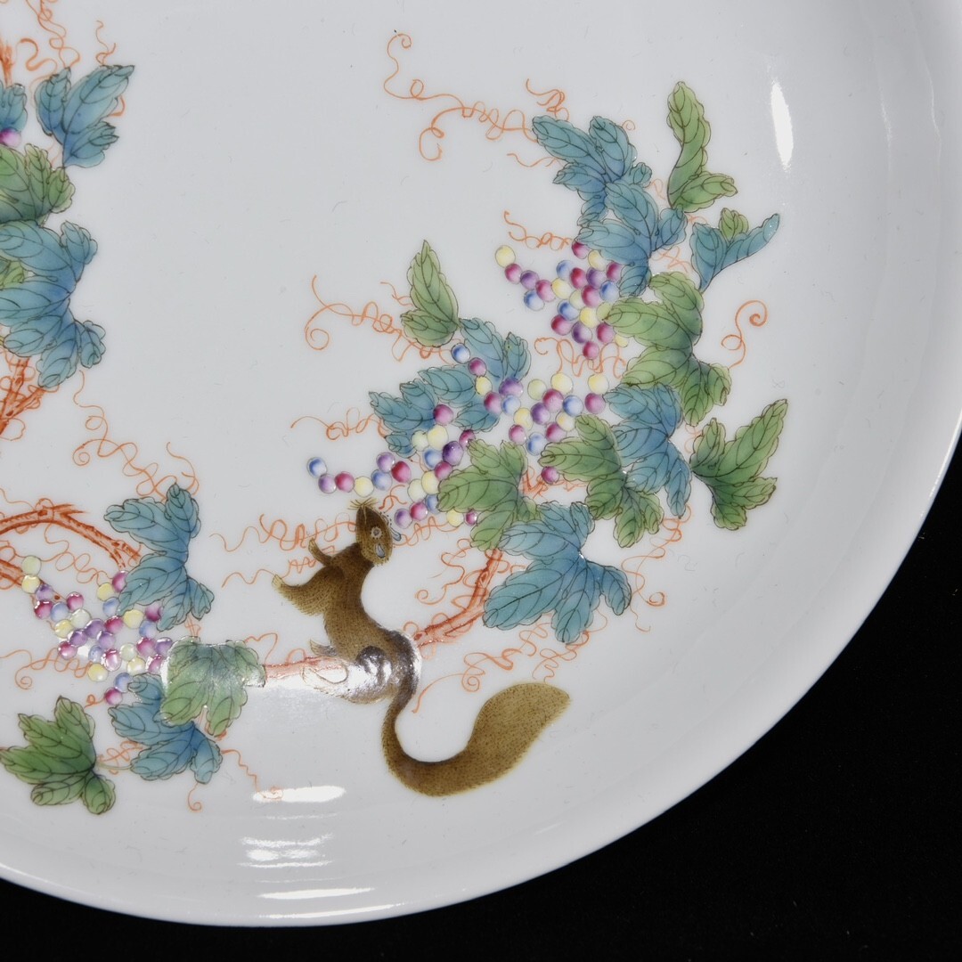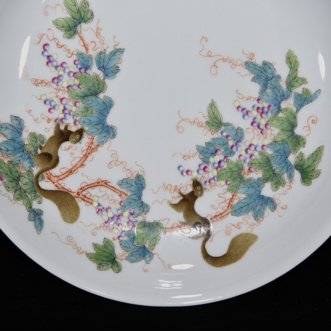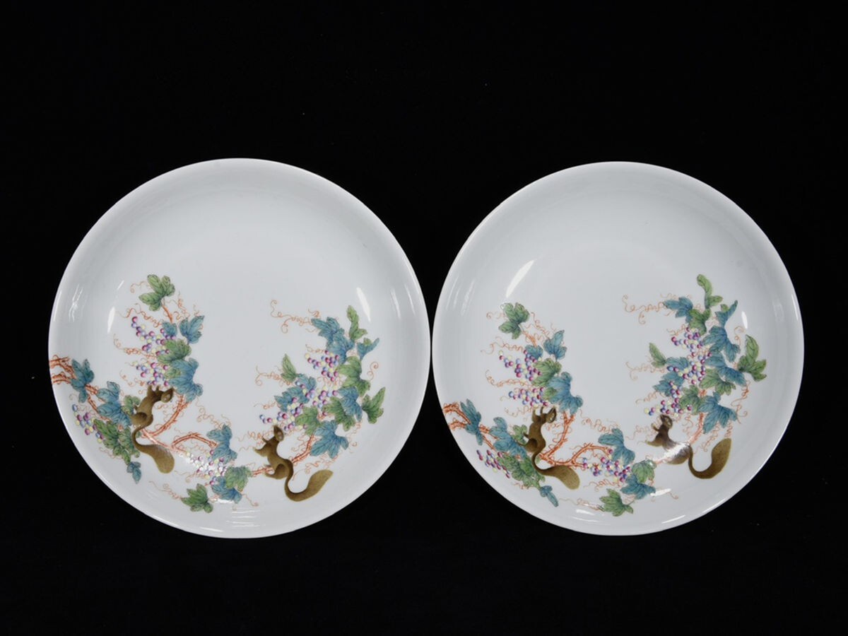 「清 雍正年製 陶磁器 粉彩松鼠葡萄紋 盤一対」染付 置物 擺件 古賞物 中国古美術 旧蔵出