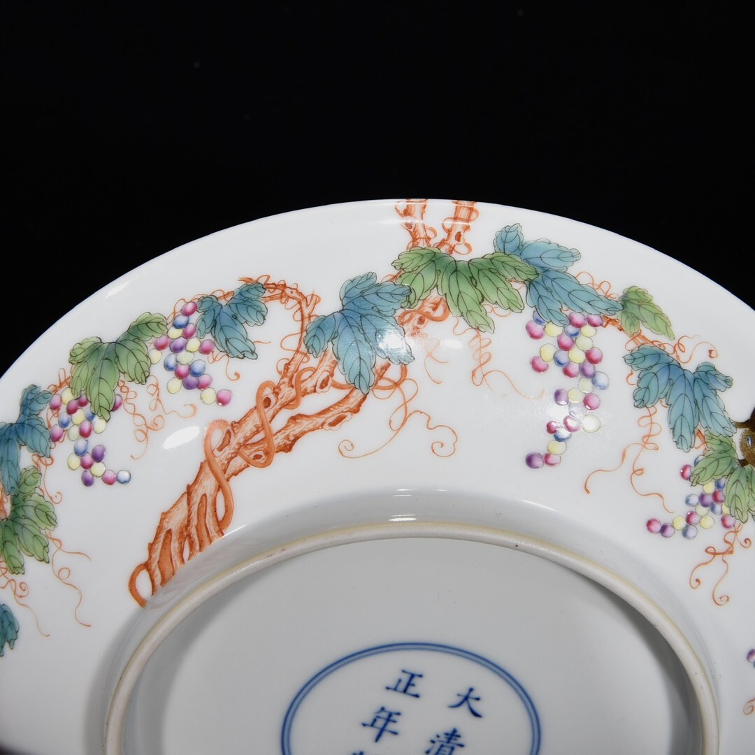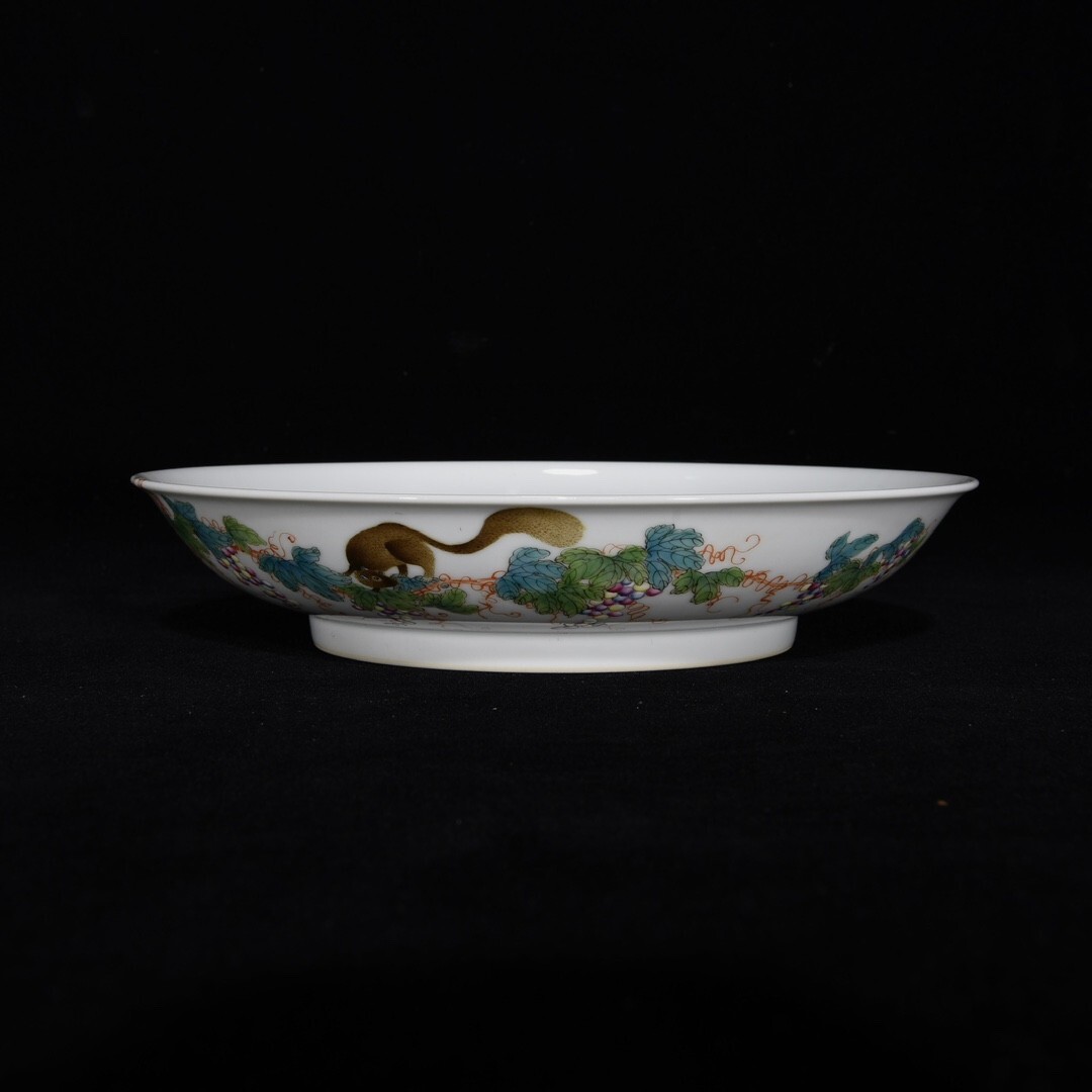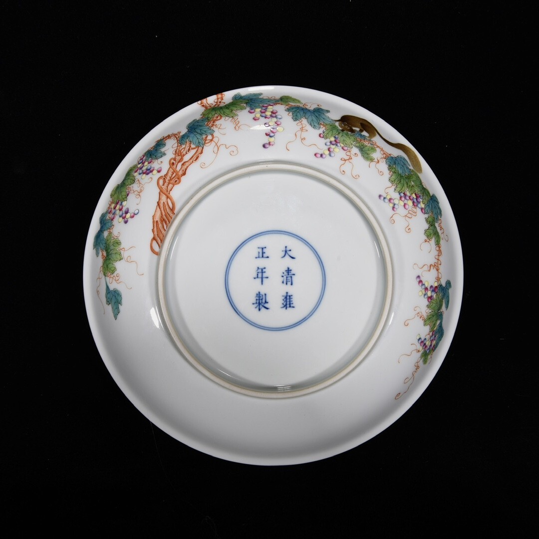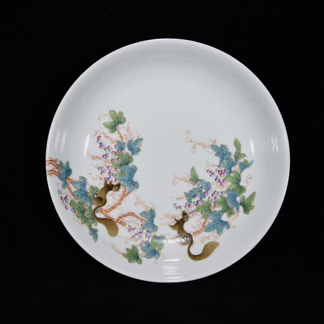 「清 雍正年製 陶磁器 粉彩松鼠葡萄紋 盤一対」染付 置物 擺件 古賞物 中国古美術 旧蔵出