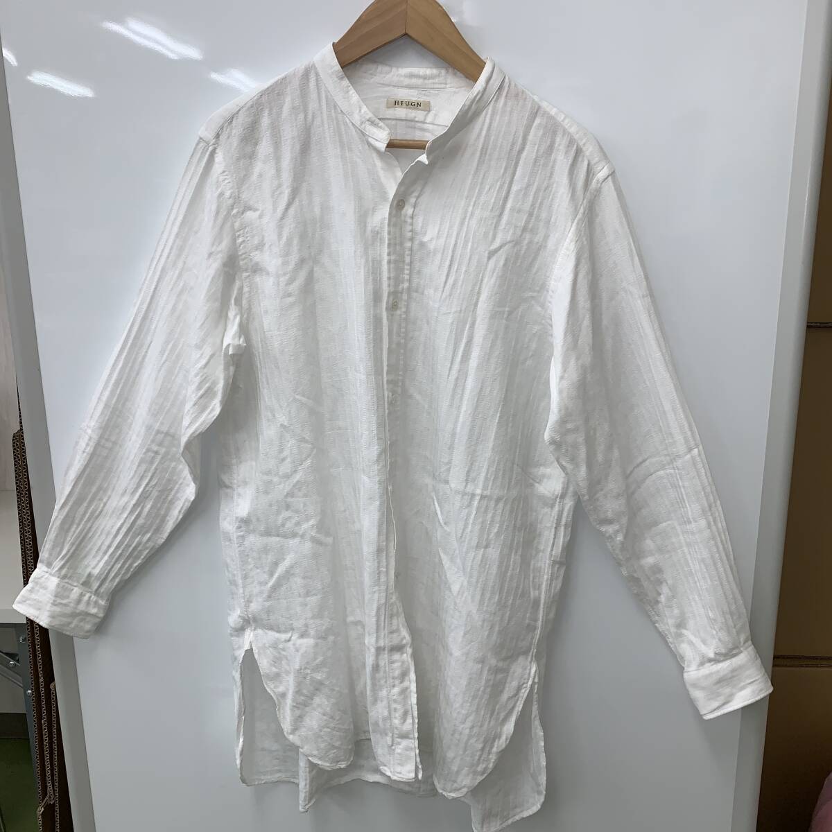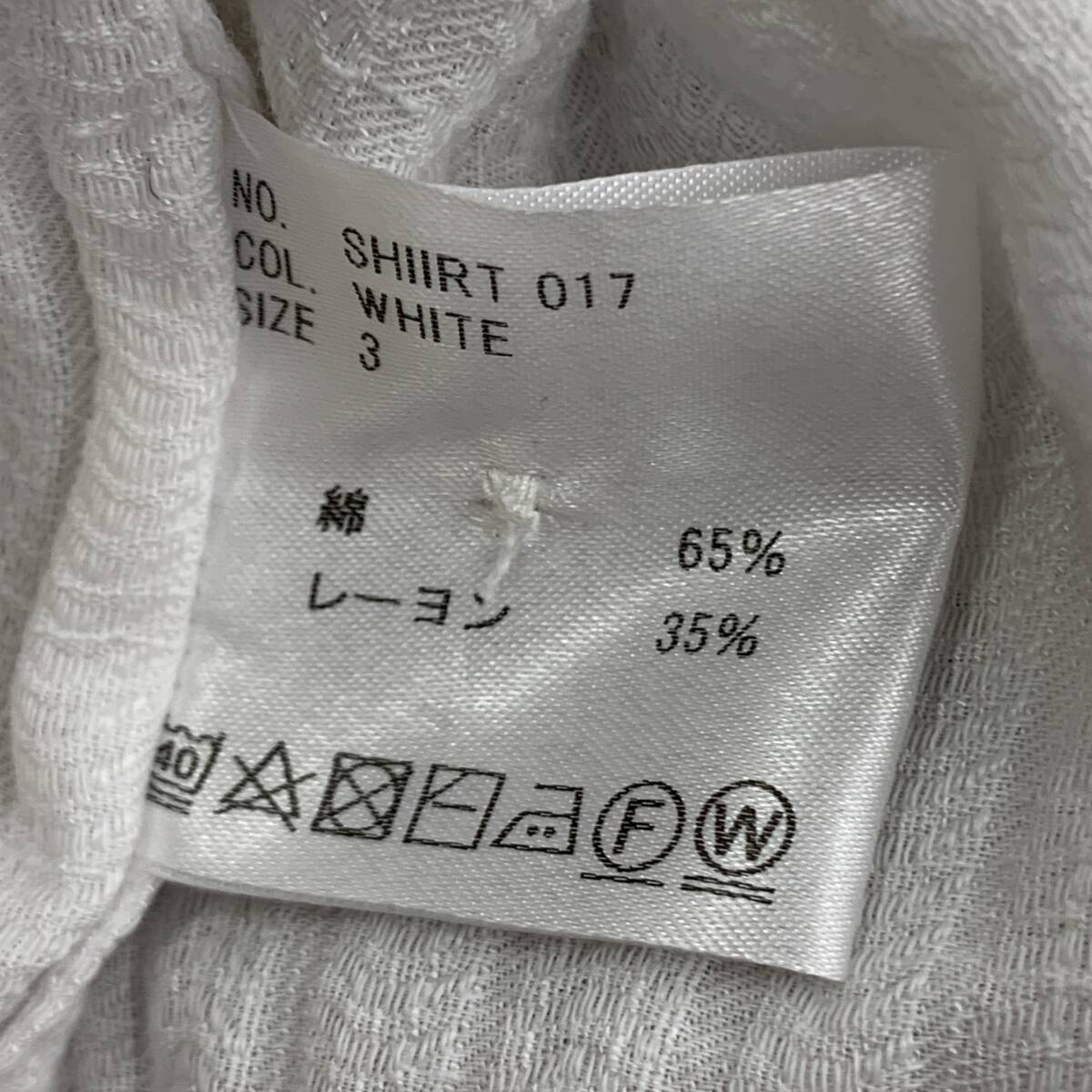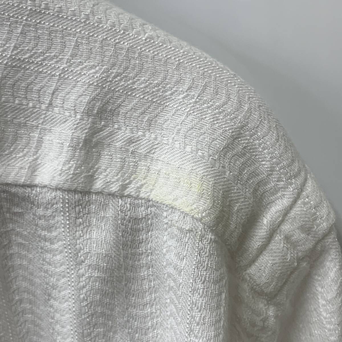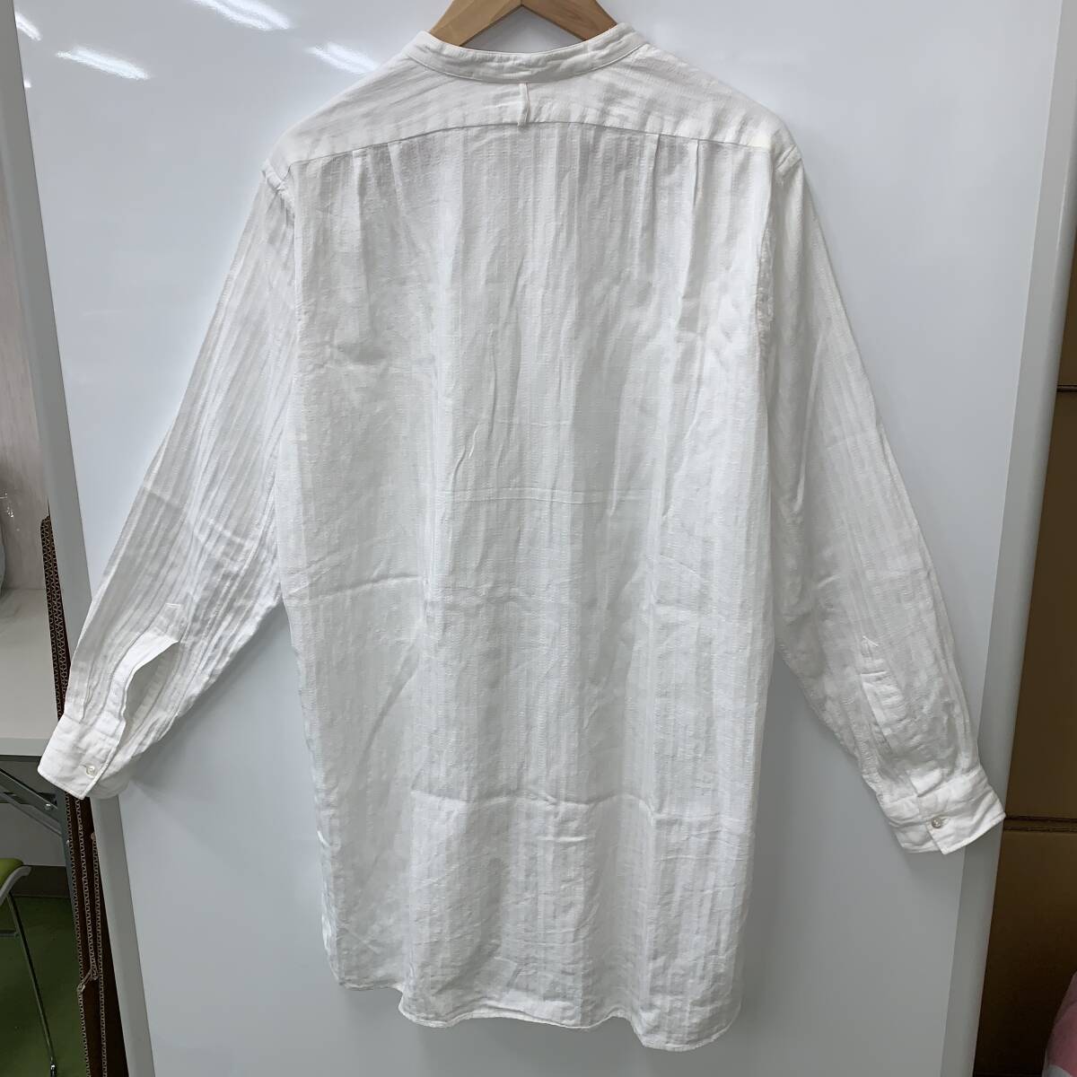 中古です。 全体的にシワ、襟に若干の黄ばみがあります。 素人による検品のため、見落としがある場合があります。 下記のサイズ表記は素人による計測ですので、誤差はご容赦ください。 ハンガーは商品に含みません。 小さめに折りたたんで梱包させていただきます。 品番:SHIRT 017 原産国:日本 サイズ:3(肩幅 約45cm、身幅 約57.5cm、袖丈 約60.5cm、着丈 約80.5cm) カラー:ホワイト 素材:コットン、リネン 素材:綿100% 付属品:交換用ボタン1個 |