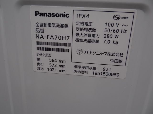 | Panasonic パナソニック 7kg「泡洗浄!!」しっかりすすぐ「パワフル滝すすぎ」コース!洗濯機 NA-FA70H7-W |