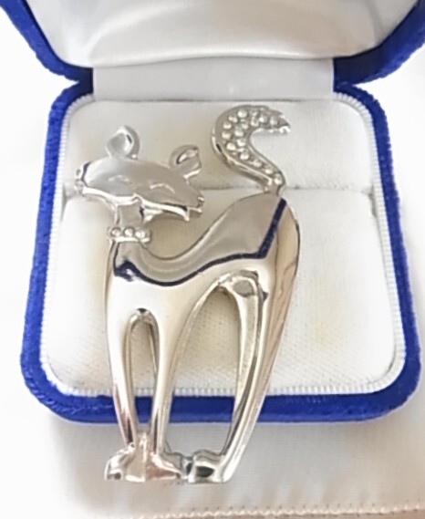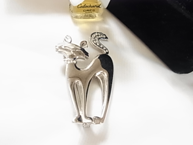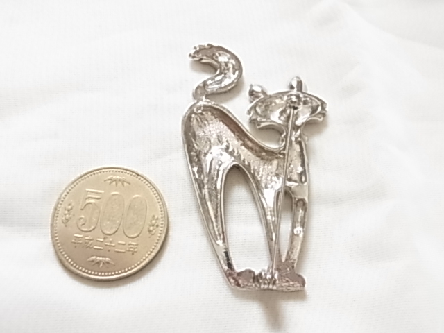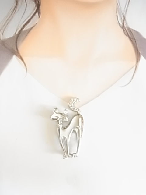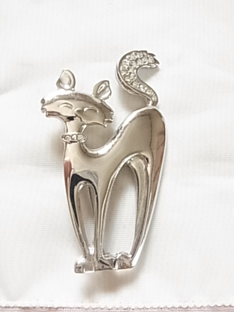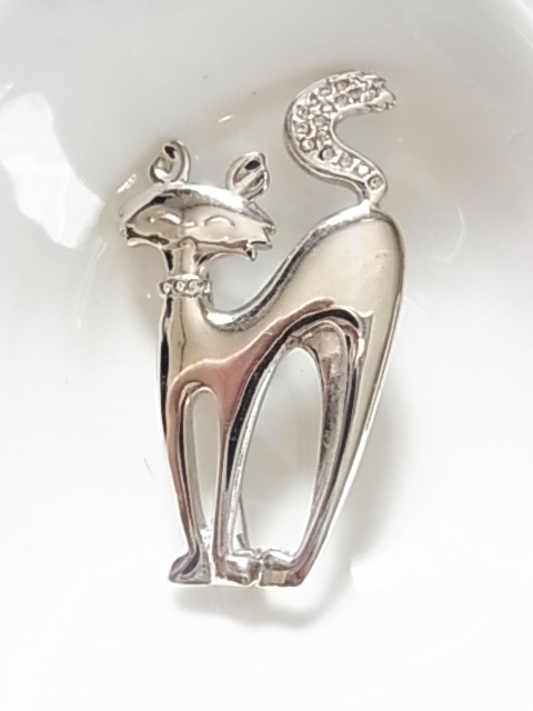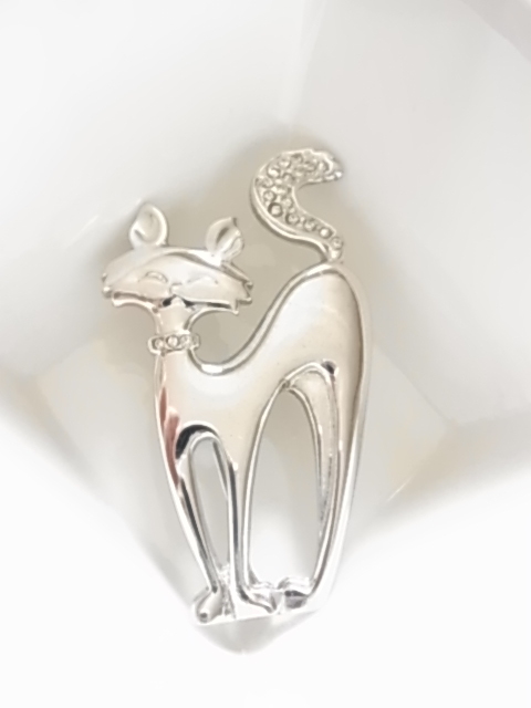 ビンテージ/ヴィンテージ シルバートーン 銀色トーンの猫ちゃん ネコ Catクリアラインストーンの尻尾も可愛い ブローチ♪♪