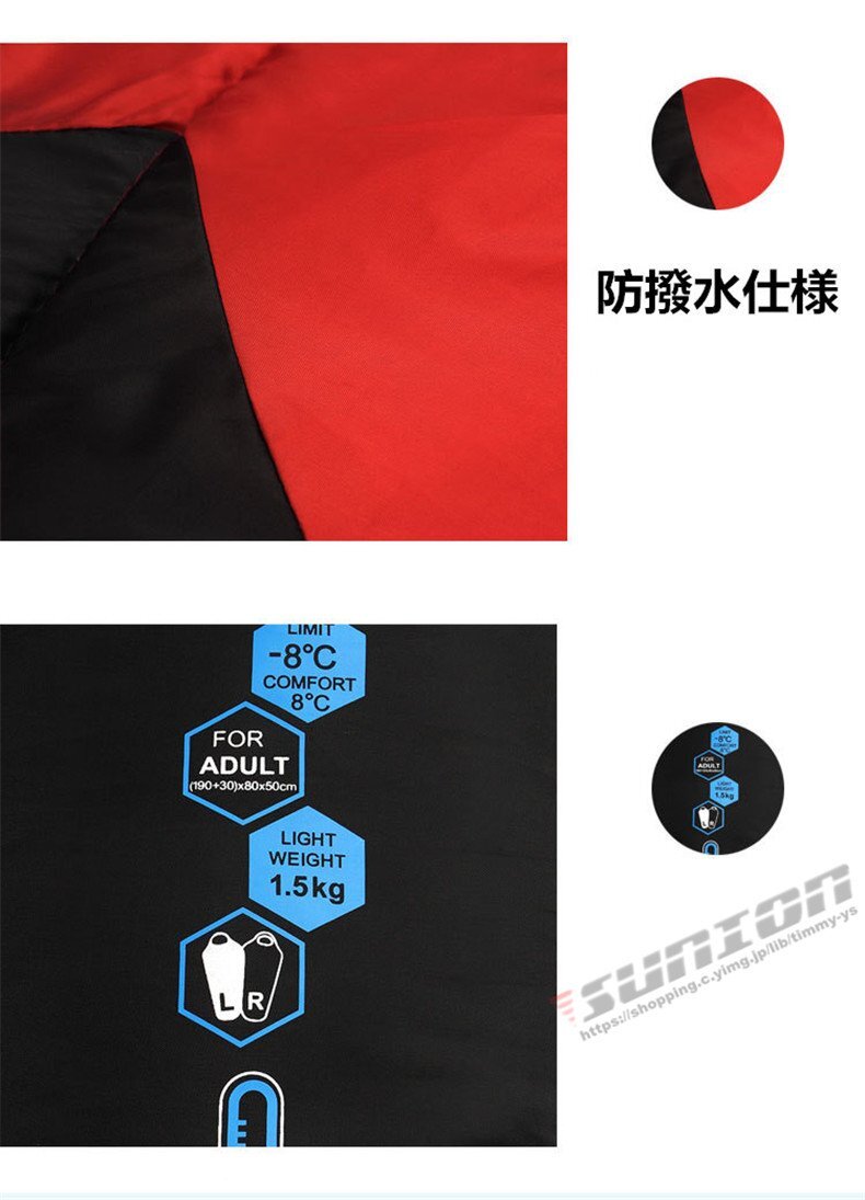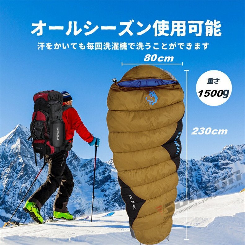 【商品スペック】■商品名:マミー型 寝袋 ■サイズ 約220cm×80cm×50cm■収納サイズ 約25*40cm■総重量:約1.85KG■生地表地: 190T Polyester W/R裏地: 190T Polypongee■中空綿充填量: 500g■快適使用温度/下限温度 -10℃~5℃ / -15℃■同梱品:210Dオックスフォード収納袋【商品特徴】◎寒い季節にも暖かく快適な眠りをとることができるように、 ジッパーとマジックテープで隙間から入る冷気もシャットアウト。◎フードにはドローコード付きで、絞れば完全防風で暖かい。◎ダブルジッパー仕様で、裏地を巻き込みにくく、滑らかな開閉が可能です。◎展開することで敷布団や掛け布団にも使える 柔らかいポリエステルシルク生地で肌にやさしく、快適です。◎使用後はくるくるを折りたたんで、収納袋に入れるだけの簡単コンパクト収納。 場所をとらないので、防災用などに準備しておいても安心です。◎キャンプなどのアウトドアにはもちろん、防災用にも!