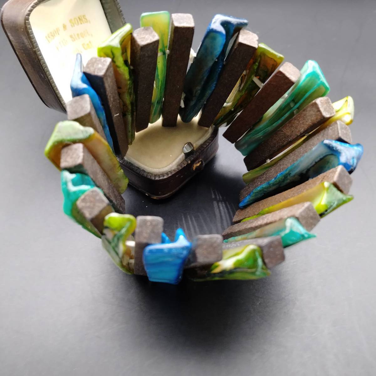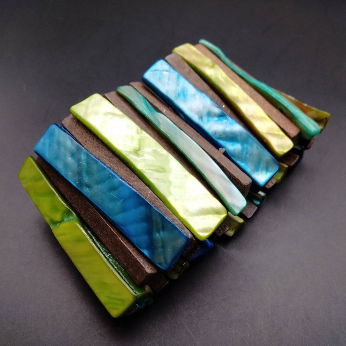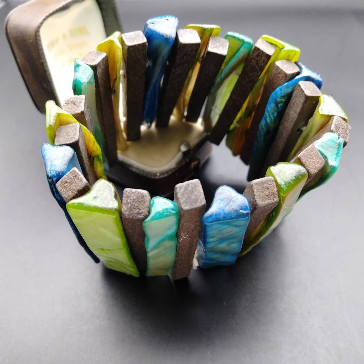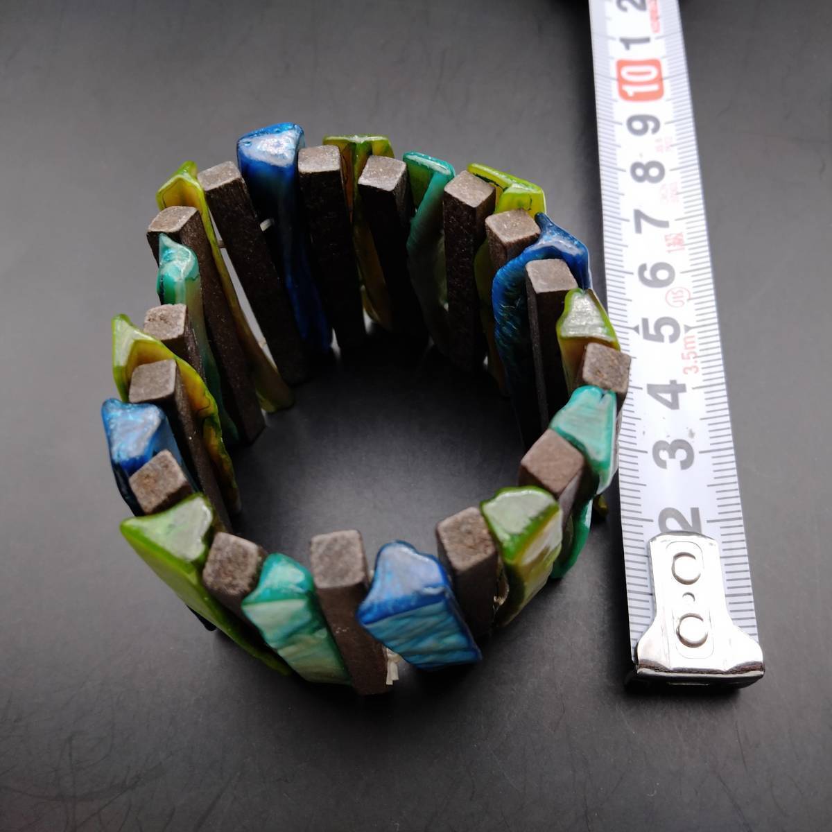 ブルー グリーン グラデーションカラー スティックストーン ヴィンテージ ブレスレット 極幅広 レトロ ジュエリー 存在感 SAE①