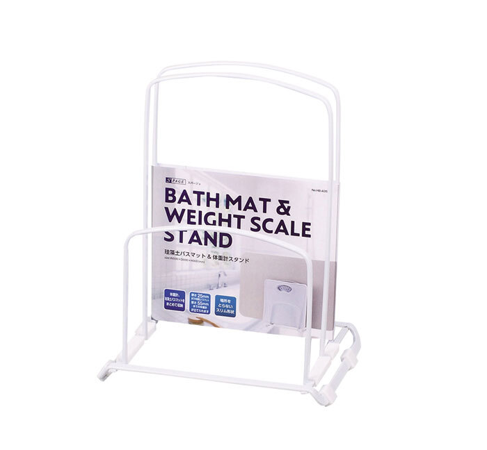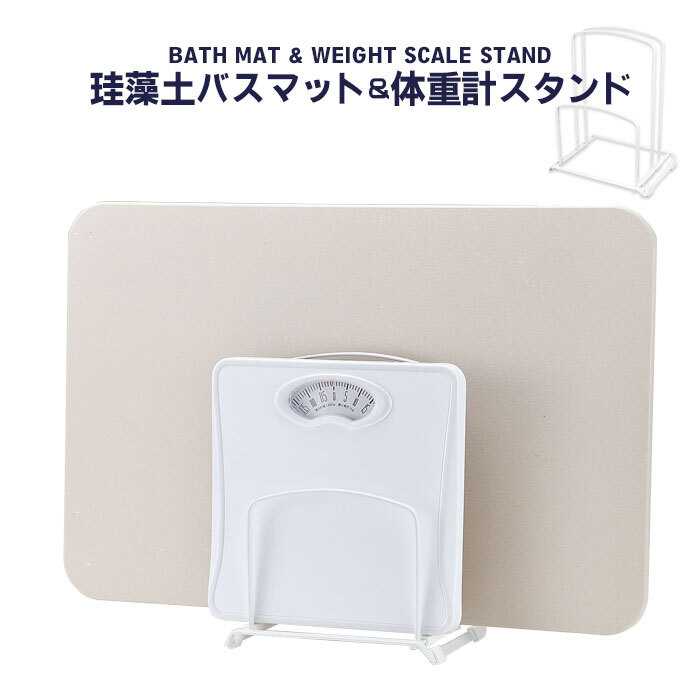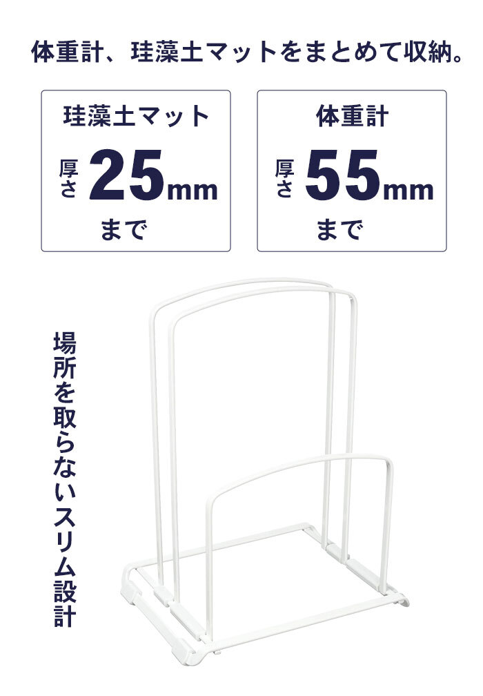 | 珪藻土バスマットと体重計をまとめてスリムに収納できるスタンド。 立てて収納するからすっきり乾燥。 珪藻土バスマット使用後の日陰干しや掃除、使わないときなどに場所をとらずすっきりと収納できます。 厚さ25mmまでの珪藻土バスマットと厚さ55mmまでの体重計が立てられます。 場所をとらないスリム形状。 |