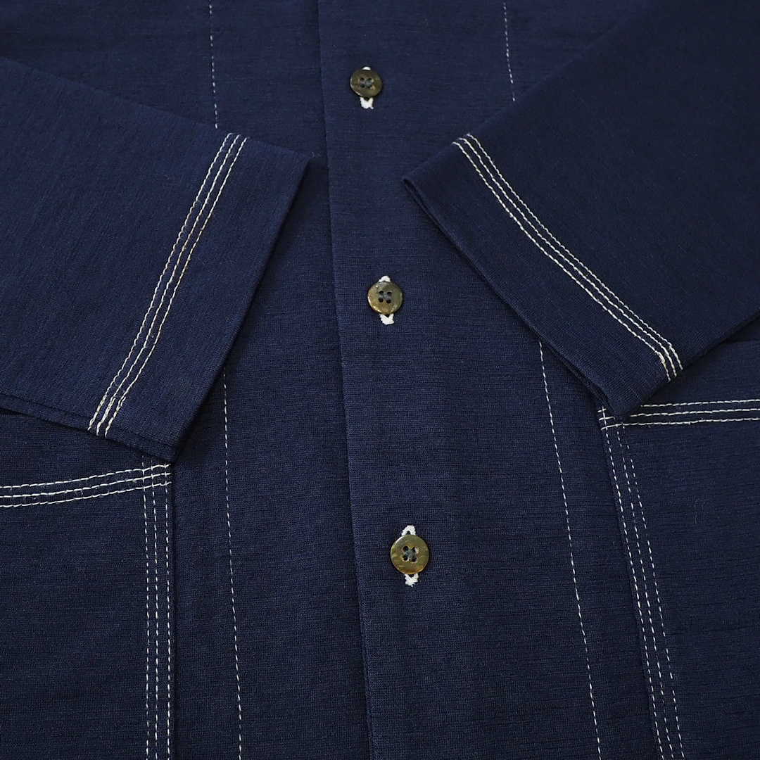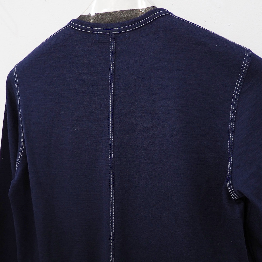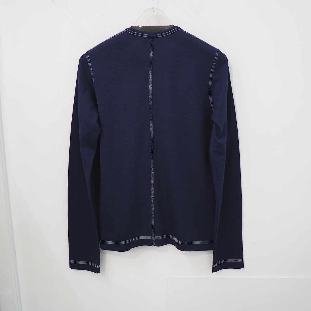 AD199890sアイテムで、薄手のウールニットを使用し、丸首の長袖型、ランダムに見えるステッチデザイン、2ポケットなど、細部まで凝ったデザインです。