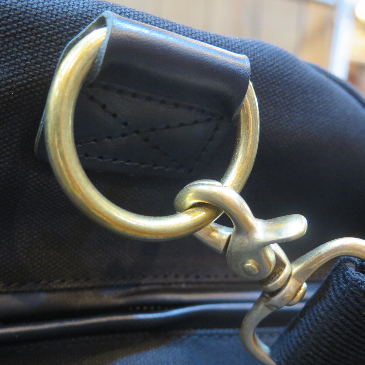 取り外し・長さ調整が可能なショルダーストラップをブラスリングで本体に連結。