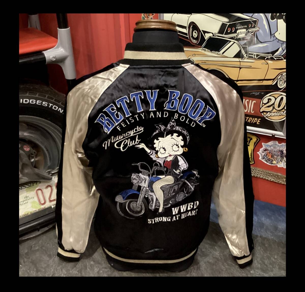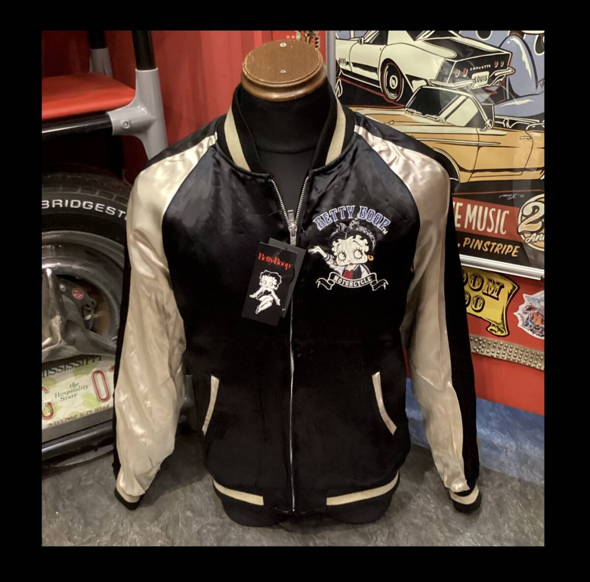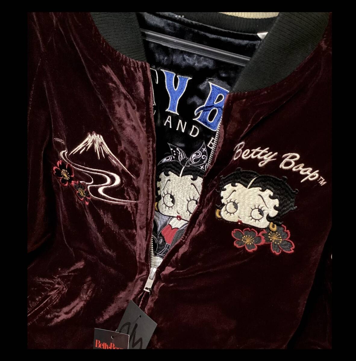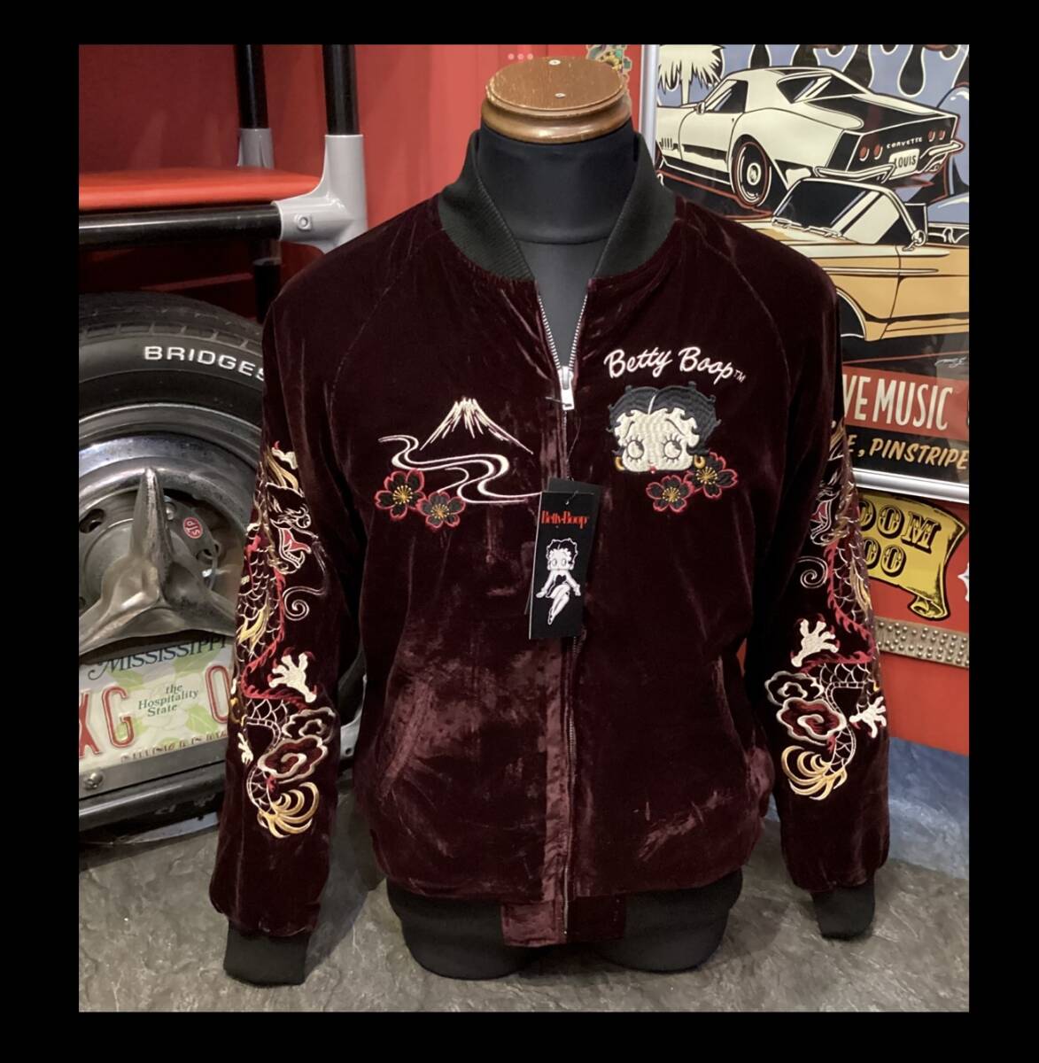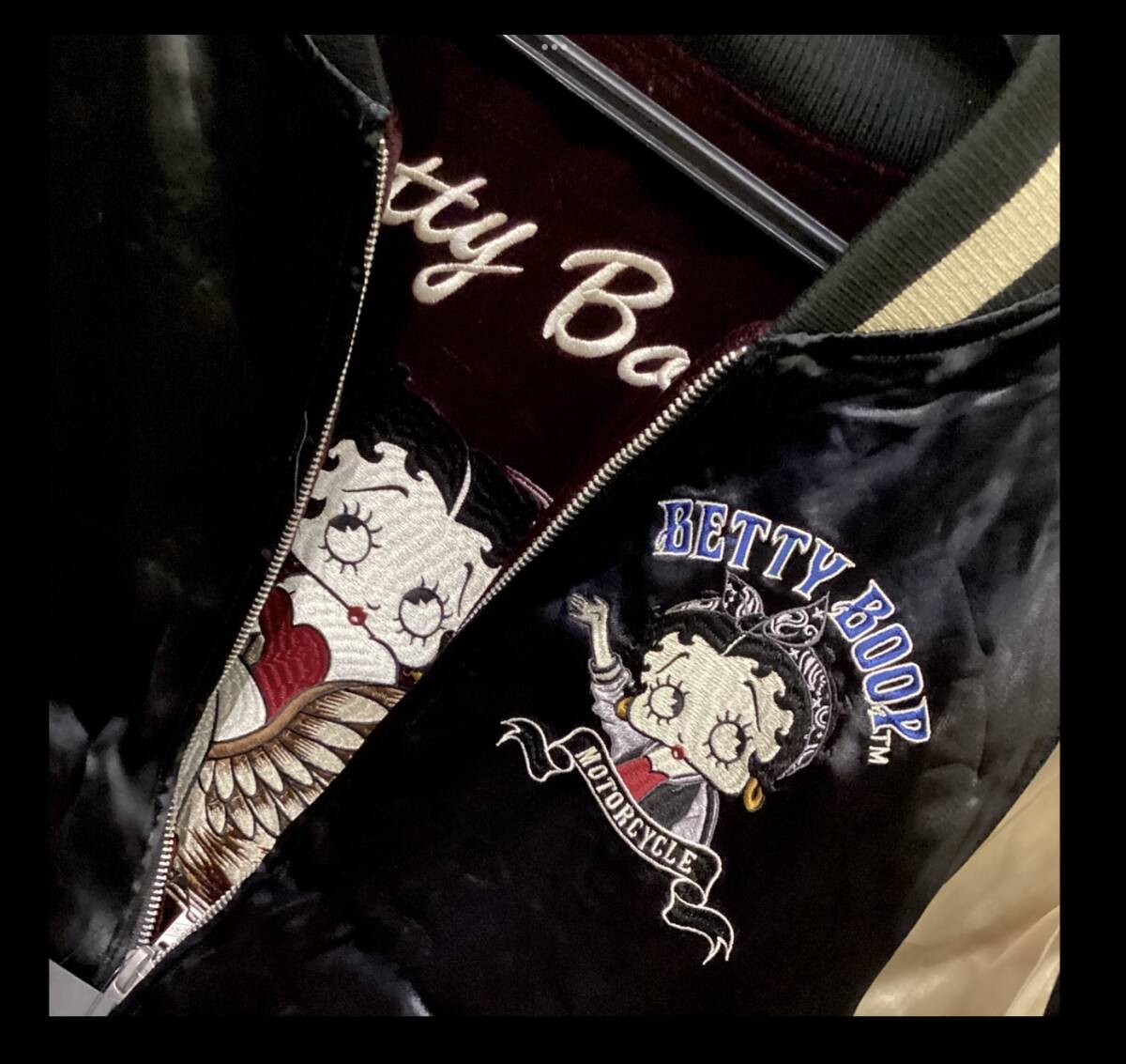★ 世界で愛され続けるセクシーポップキャラクター「BETTY BOOP」から高級感ある上質レーヨン素材面とベルベット素材使用 、両面ともに豪華刺繍デザインが施されたリバーシブルスカジャンです。タウンユースでもインパクトのあるデザインで バイカーには季節問わずの プレミアムアイテムです。