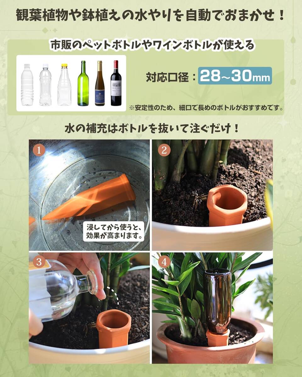 【観葉植物や鉢植えの水やりも自動で安心】 植木鉢、プランター、花壇など、土が入っている環境であればどこでも使用可能です。また、取り付け可能なボトルの口径は28〜30mmと、市販のペットボトル(500ml〜2L)やワインボトルなども使用可能。水の補充だけで繰り返し使用できます。※直接水やり機に水を入れても使えます。観葉植物はもちろん、ベランダ菜園やお花の寄せ植えなどにも幅広く対応できます。