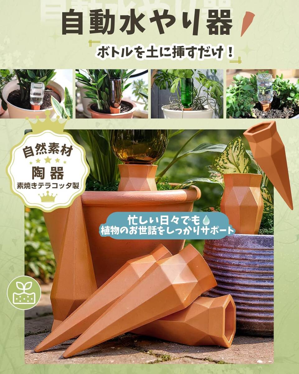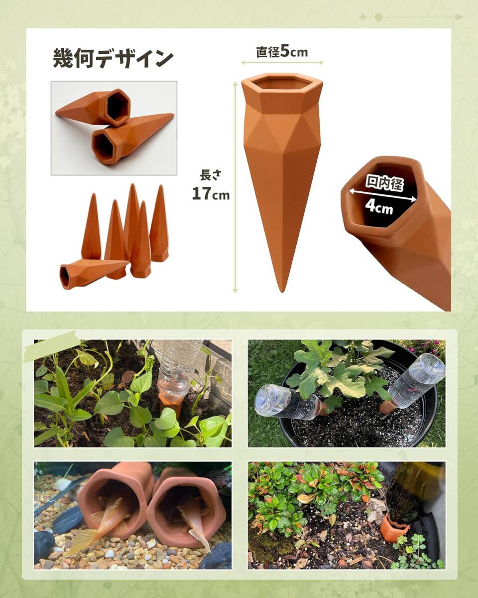 【組み立て不要、ラクラク設置|万が一の破損時も交換保証付き】 組み立て不要で使い方はとても簡単。幾何デザイン(約):5.0(直径)×17cm(長さ)/口内径:4cm 花びらデザイン(約):5.4(直径)×17.5cm(長さ)/口内径:4.3cm。※本製品は陶器製のため、輸送中の破損に関しては交換保証がございます。ご安心ください。①差し込み用の穴を掘る ②水やり器をセットする ③ボトルに水を注ぐ 指で蓋をしながら差し込む 逆さにボトルをセットして完了。※ボトルは付属しておりません。毎日こまめな水やりが難しい方や、水をあげ過ぎてしまう心配のある方に最適。