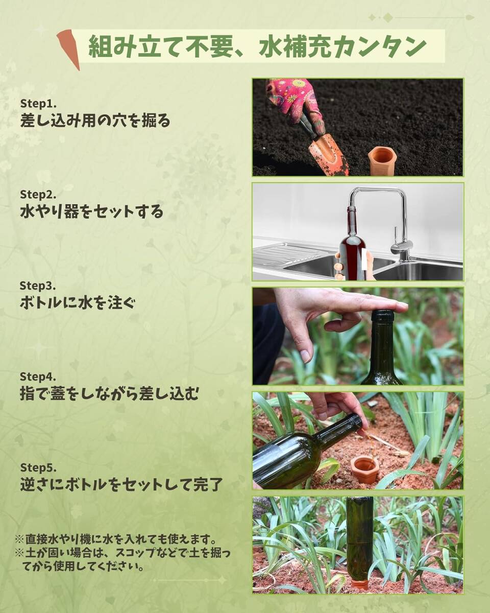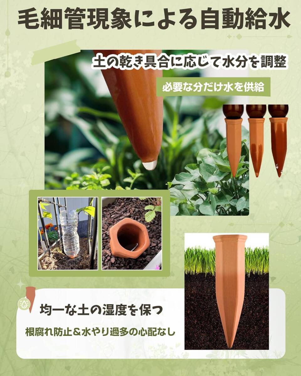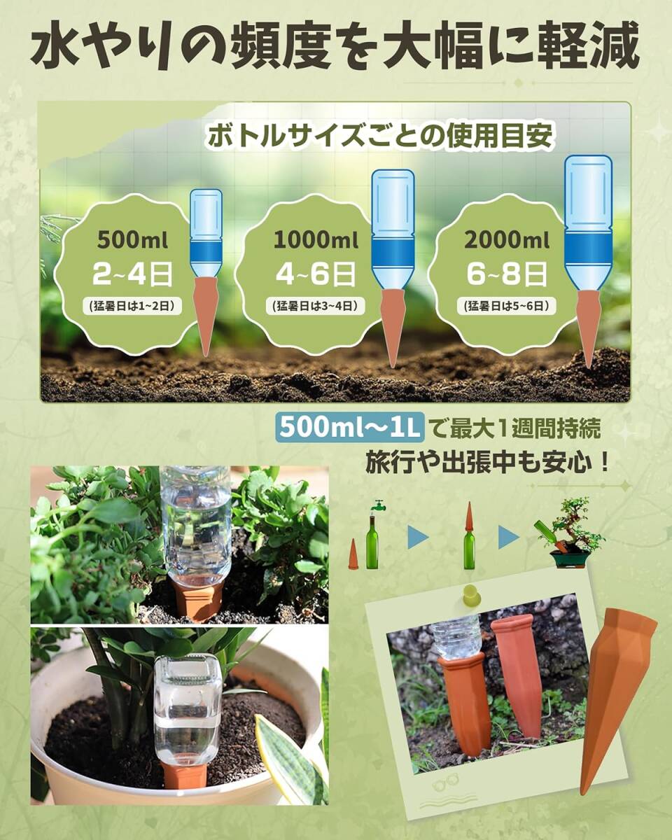 【水やりの頻度を大幅に軽減|500ml~1Lで最大1週間持続】 使用するペットボトルのサイズに応じて給水の持続時間が変わります。500mlのボトルで2~4日、1Lのボトルで5~7日間、土壌へ安定して水分を供給します(※夏場など高温時は短くなる傾向があります)。<ボトルサイズごとの使用目安> 500ml:2~4日 (猛暑日は1~2日) 1000ml:4~6日 (猛暑日は3~4日) 2000ml:6~8日 (猛暑日は5~6日) ※給水持続時間は植物や鉢の大きさにより増減します。