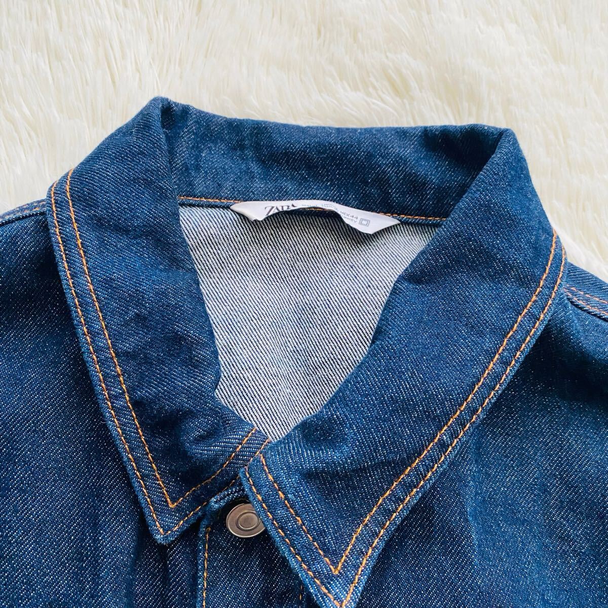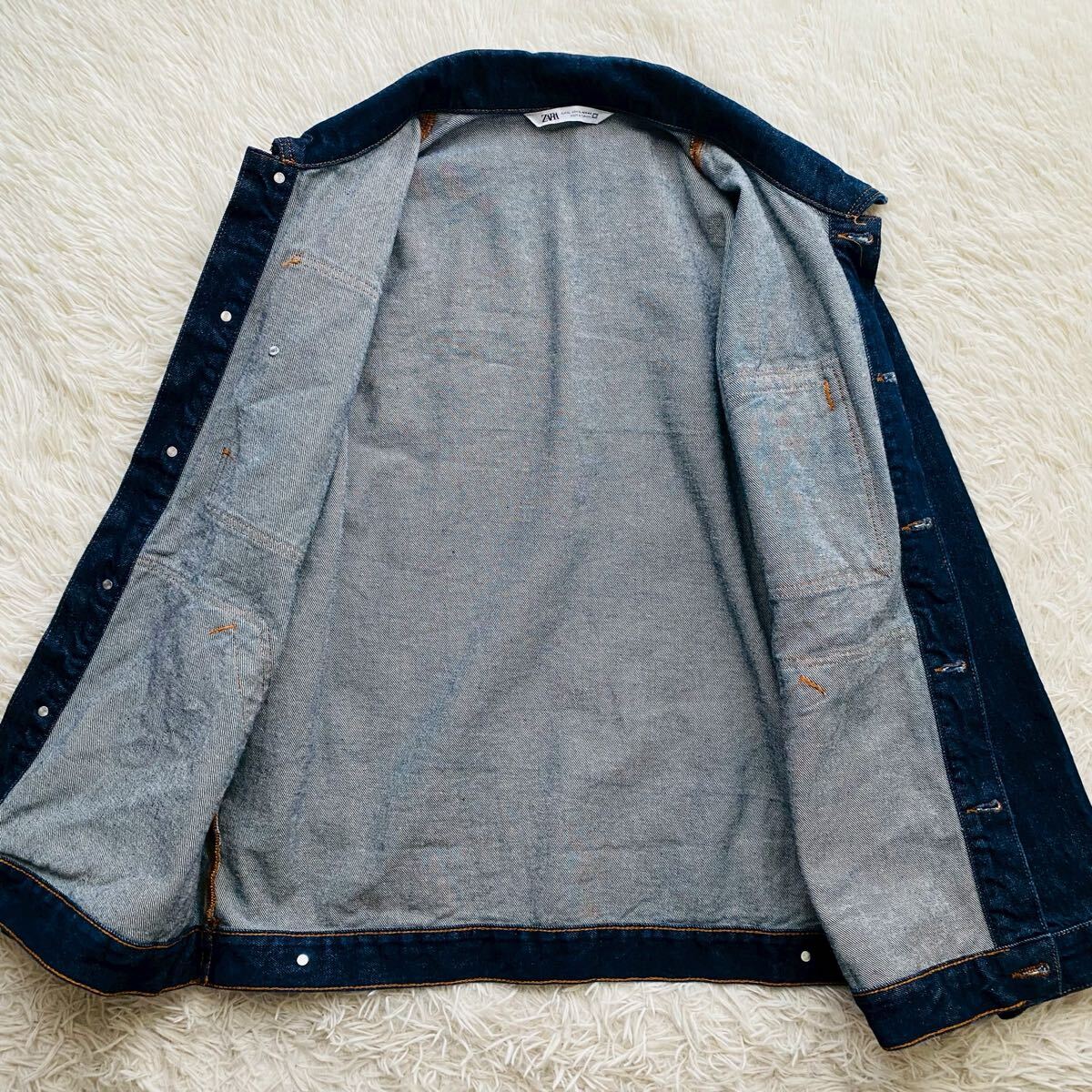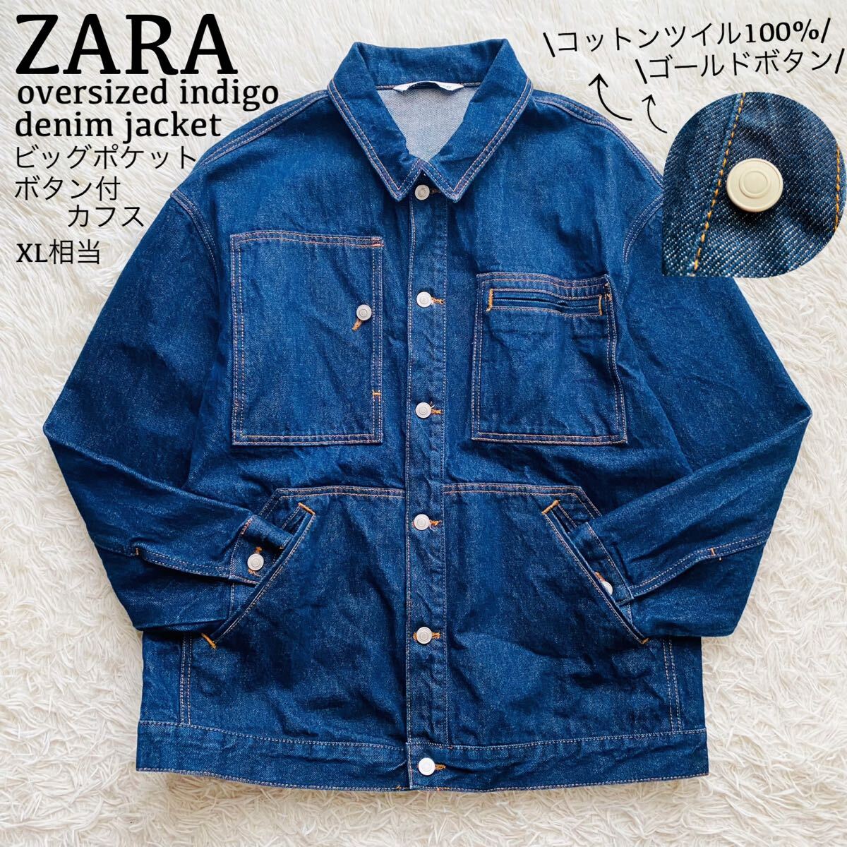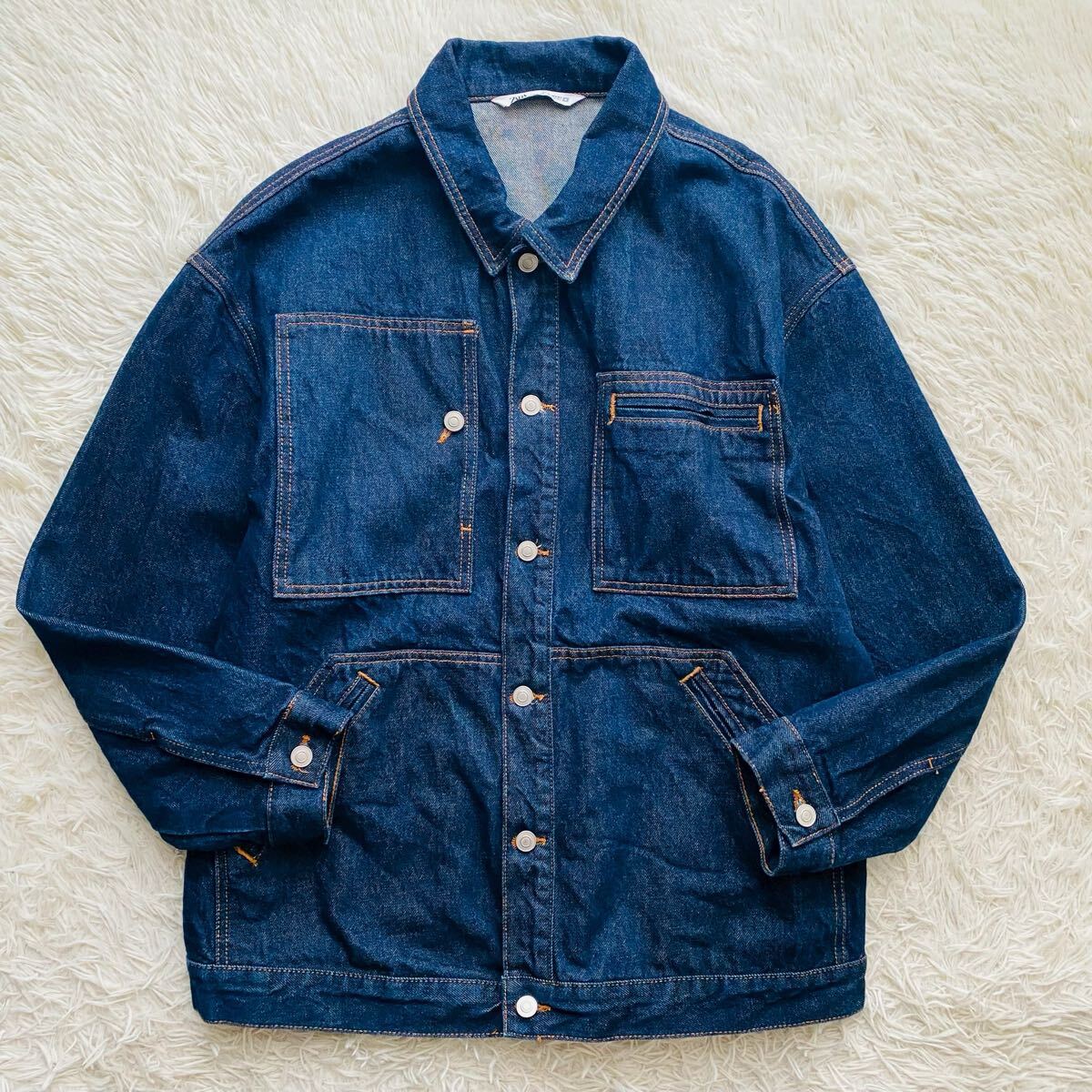 *ZARAのオーバーサイズフィットのデニムジャケット。カバーオールほど長くなく、ゆったりとしながらすっきりとした印象のトレンド感溢れる絶妙な丈感のミドルシルエットが特徴。耐久性の高いコットンツイル素材を100%使用、濃いめのインディゴブルーカラーはボトムスを選ばずコーデの汎用性の高さも魅力のアイテムです。