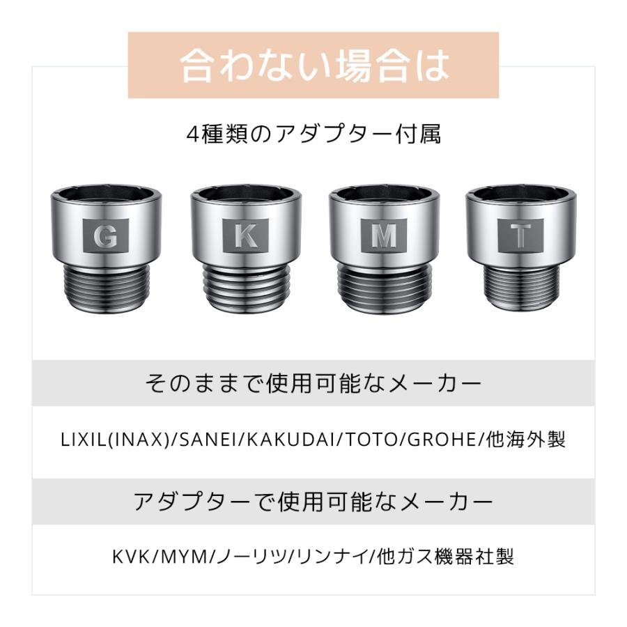 ・パッケージ内容:シャワーヘッド、本体アダプター4種、各1個付属品(ゴムパッキング、フィルター)、日本語取扱説明書(保証書付き)