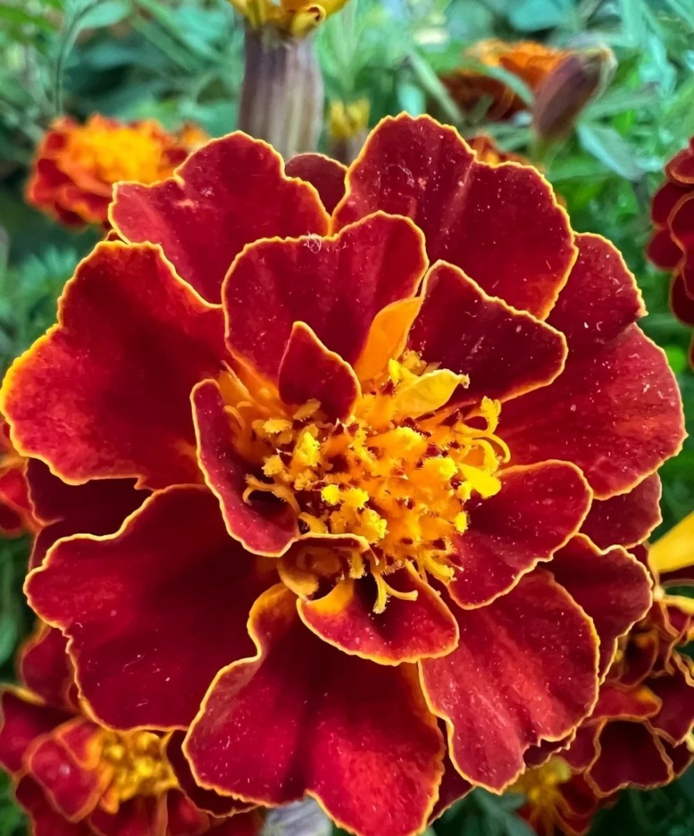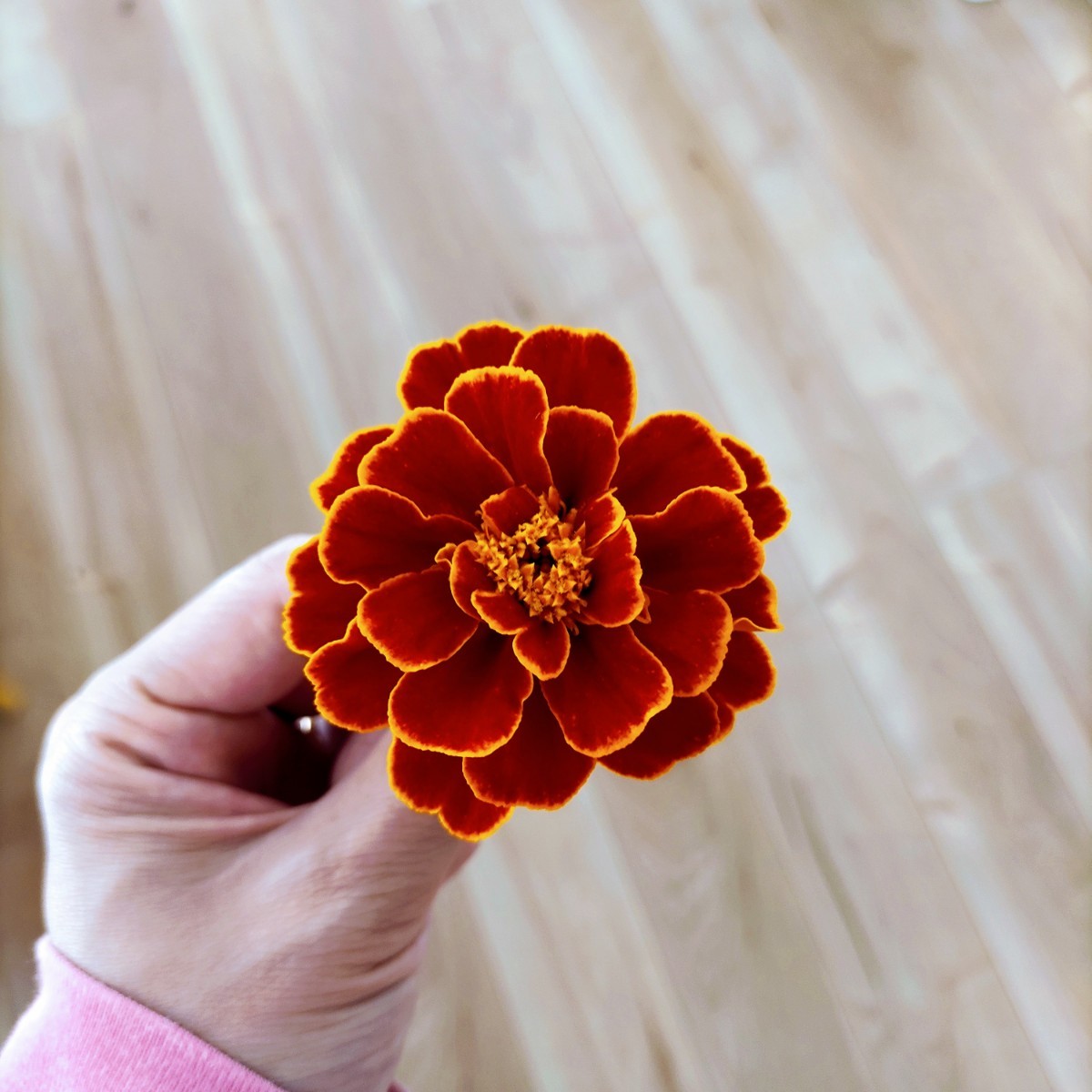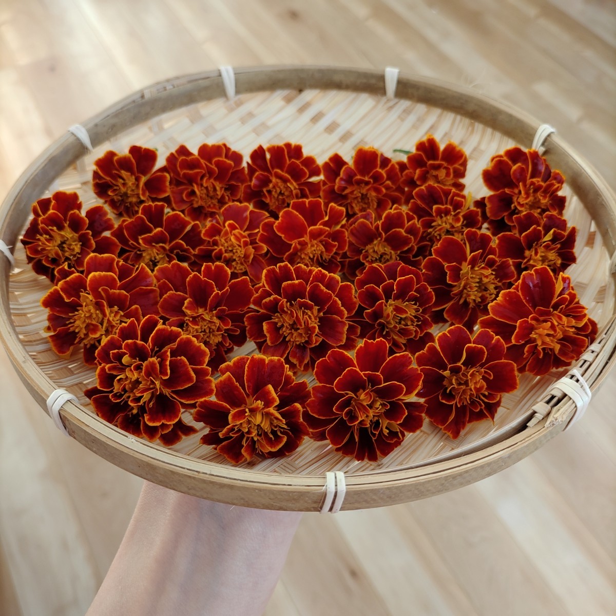 質感がある深い赤の花びら、周りに少し金色に囲まれているマリーゴールドです。とても綺麗で一目惚れ、可愛いながら高級感もあります。切花にもできます。花瓶に入れて頂き、お水だけあれば一週間くらい元気なお花をお家中にも観賞できます。お庭お玄関に植えて頂き、虫除けにも効果があります。いかがでしょうか?ぜひ育て見てくださいませ。o((*^▽^*))o