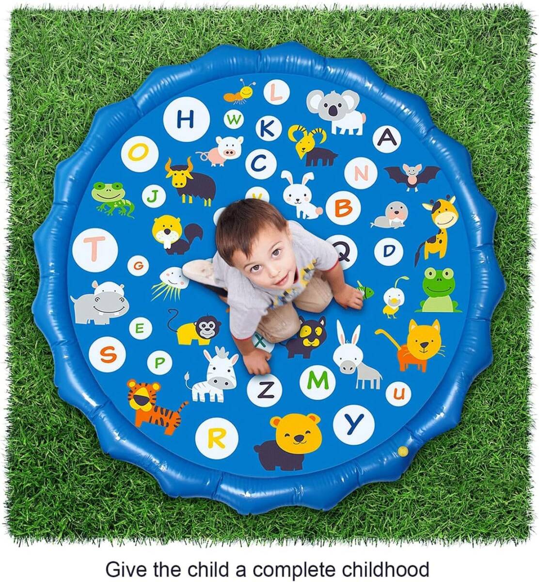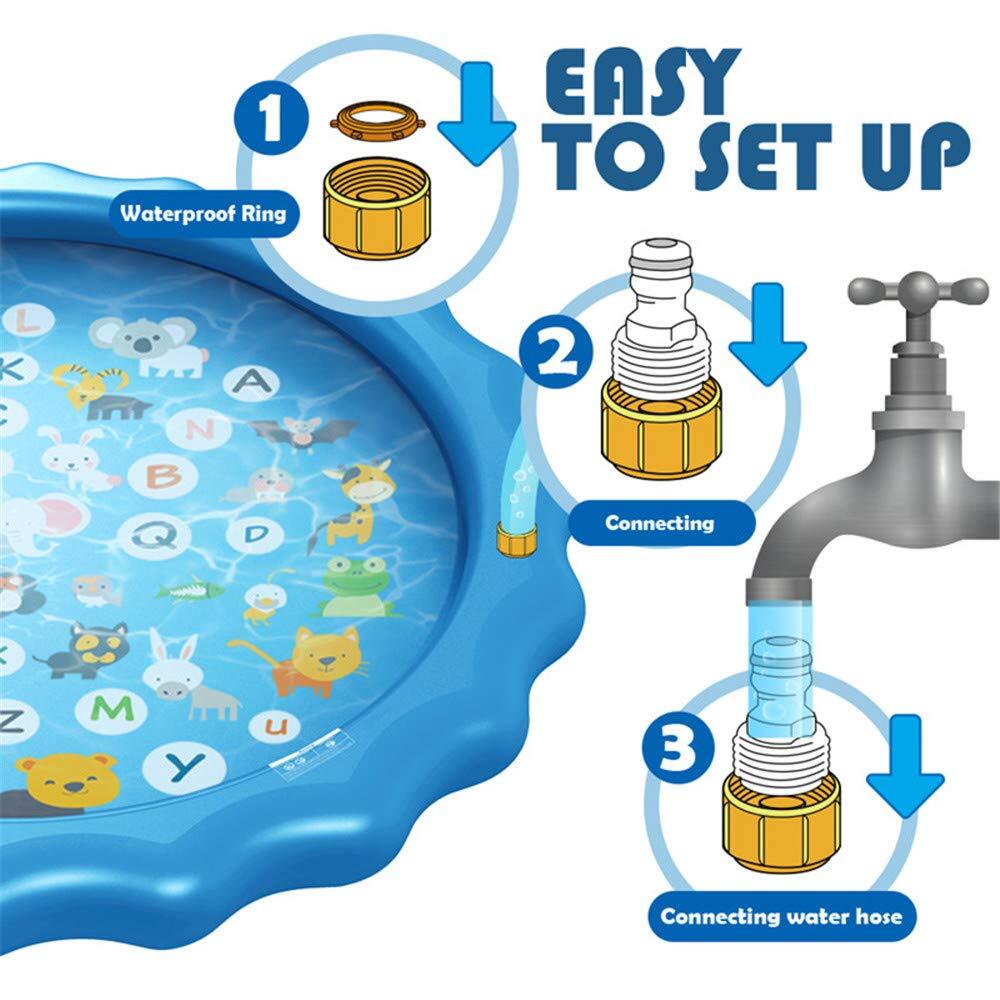 【可愛いプレイマット:】26の英字と多く動物からなるプレイマットはとても可愛いです。素敵な配色と可愛いデザイン、子供中に人気があります。子供たちは遊びながら簡単に学べ、子供の想像力を育てることができます。また、子供の遊びだけでなく、暑い日に、ペットちゃんも嬉しく遊べます。※ご注意:水を噴出し続けるためには、蛇口の水は出し続ける必要があります。