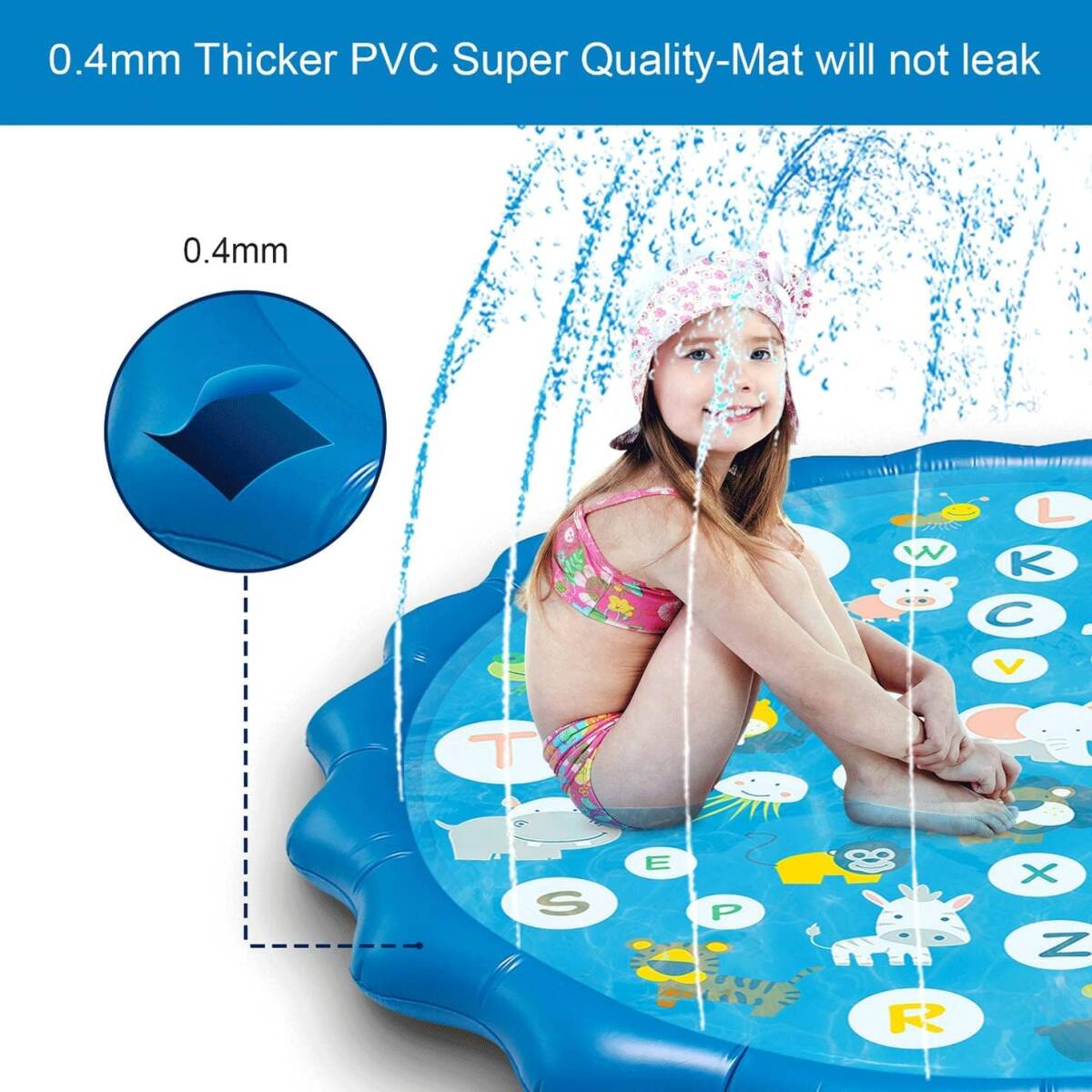 【耐久性十分:】優れたPVC材質で作られ、安全無毒です。単層の厚さは0.3mmで、他社のより、厚さは30%増やします。厚手の噴水マットは長持ちして、割りにくくて、水漏れにくいです。表面は柔らかくて、お子様を傷つける心配がありません。子供にとって100%安全です。1-5人の子供と大人に適し、男女兼用のマットです。ご注意:18歳未満のお子様は、必ず大人の伴にお遊びください。