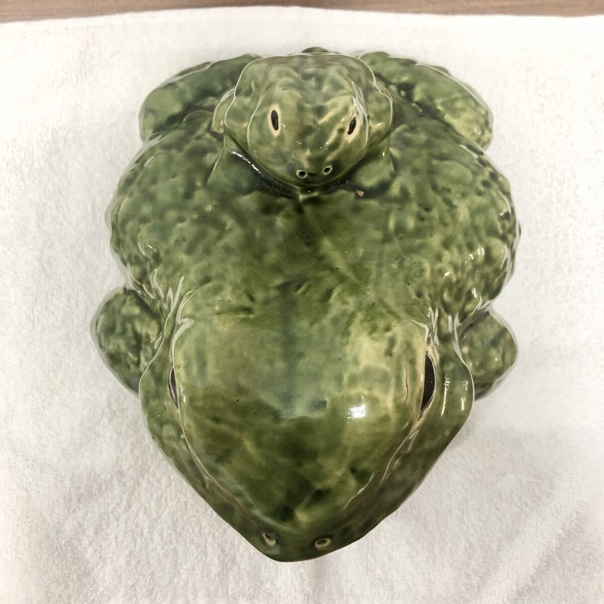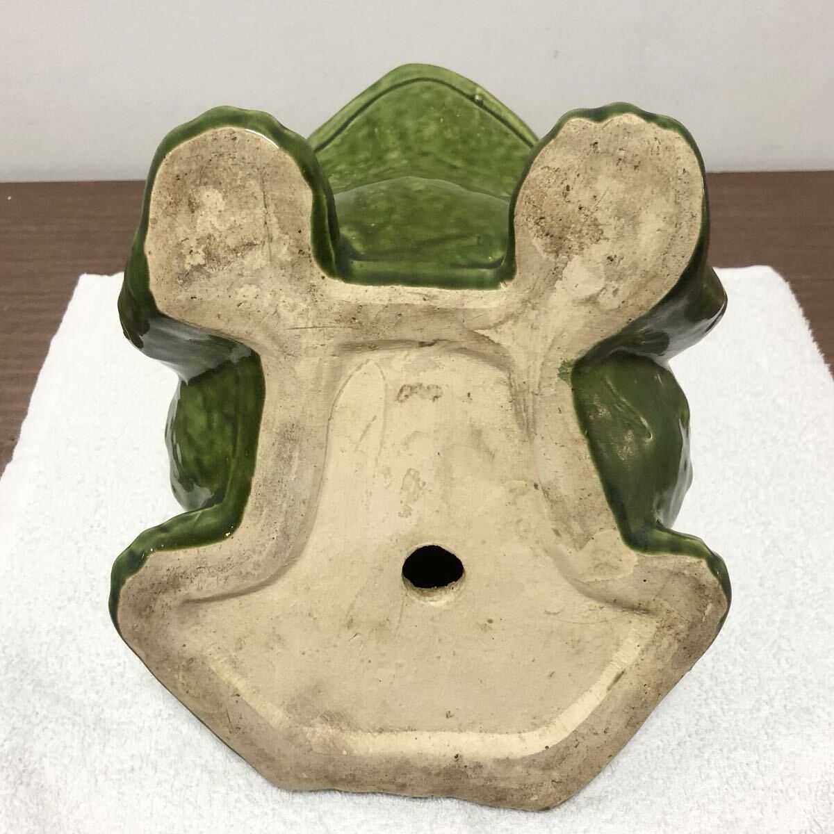 緑色の陶器製で、光沢があります。