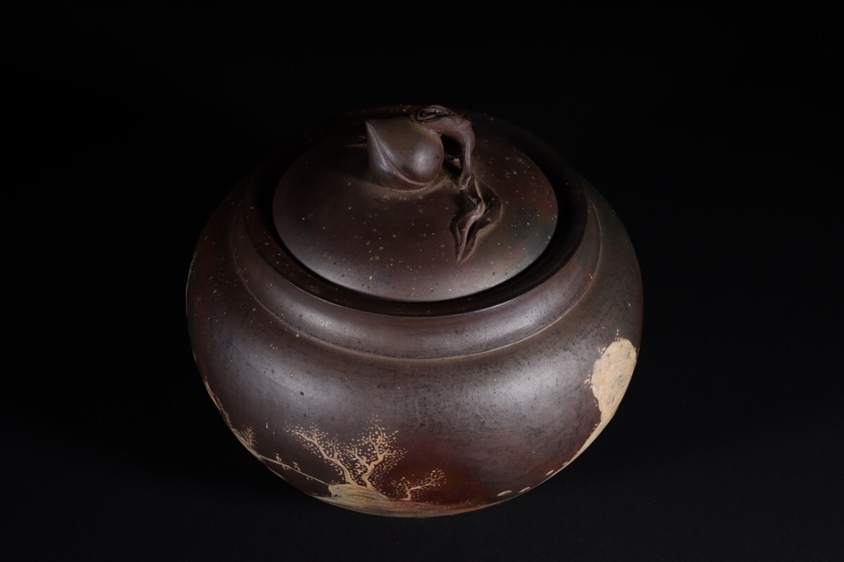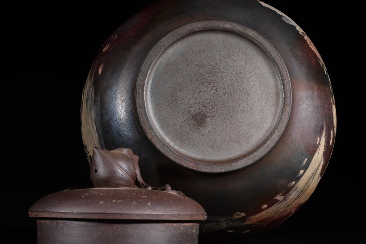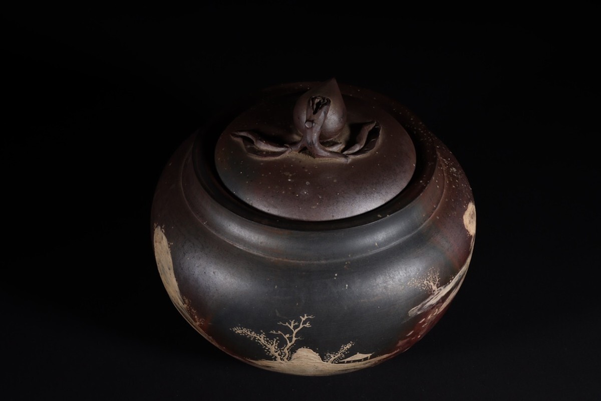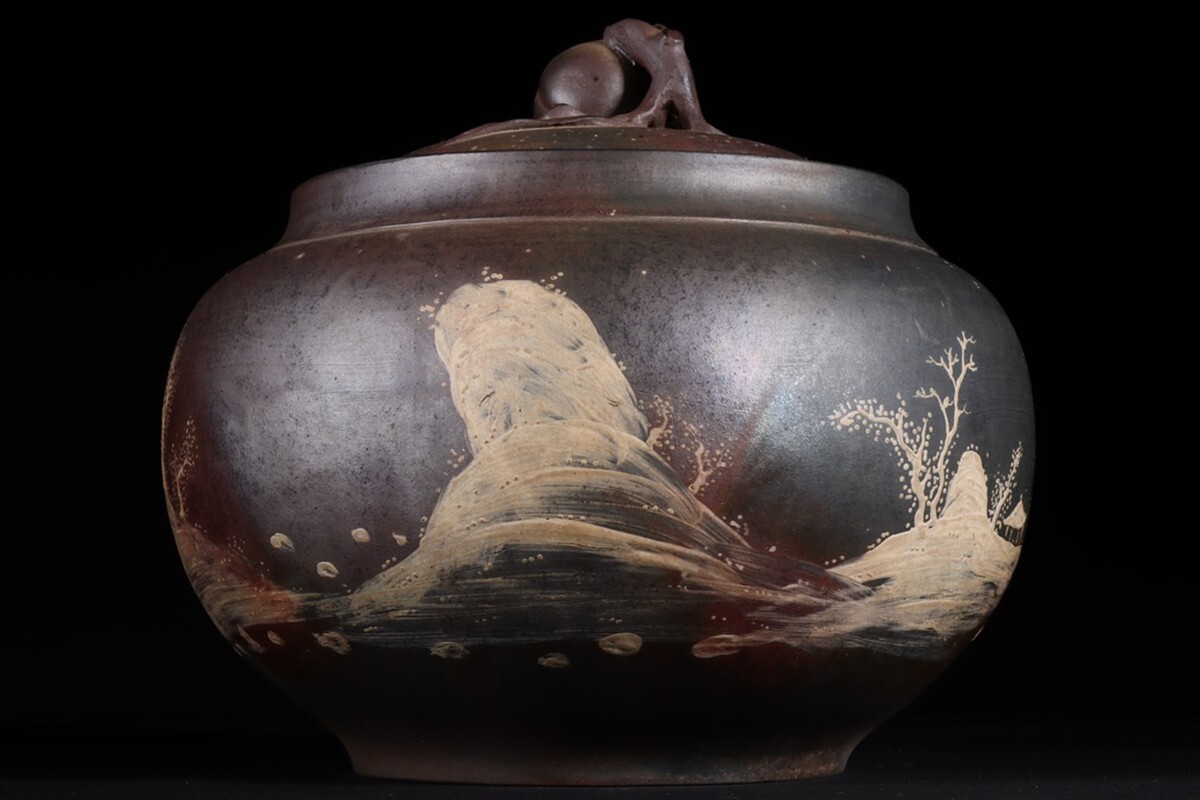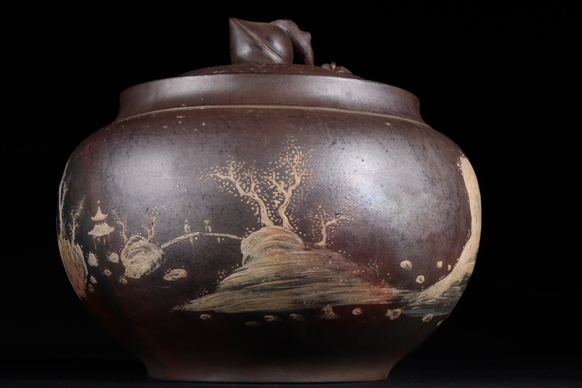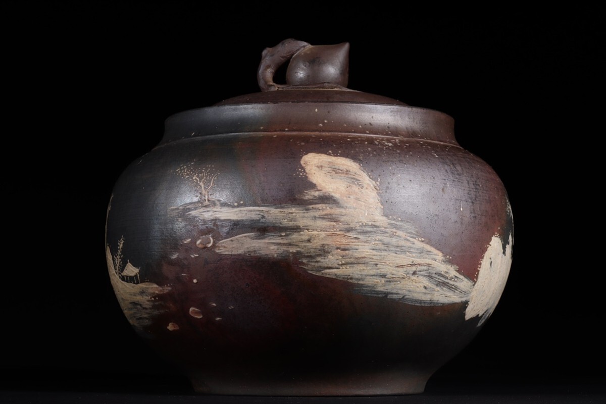 「紫砂彫 柴焼泥絵山水聖桃鈕 茶葉罐 三友堂銘 清時代」陶磁器 置物 擺件 古賞物 中国古美術 蔵出