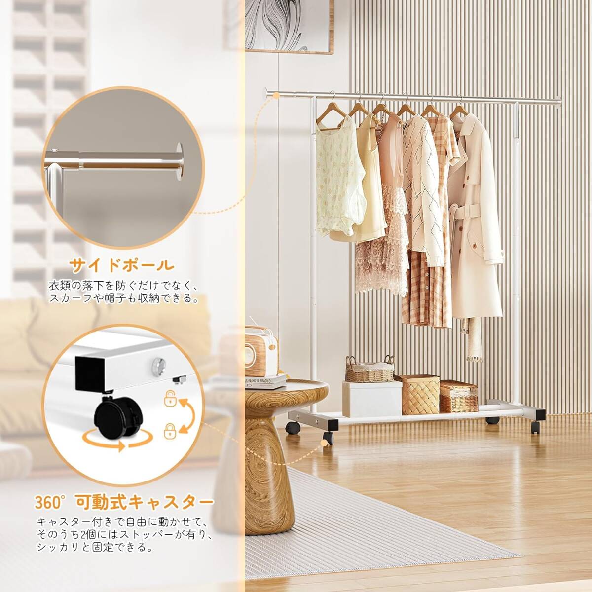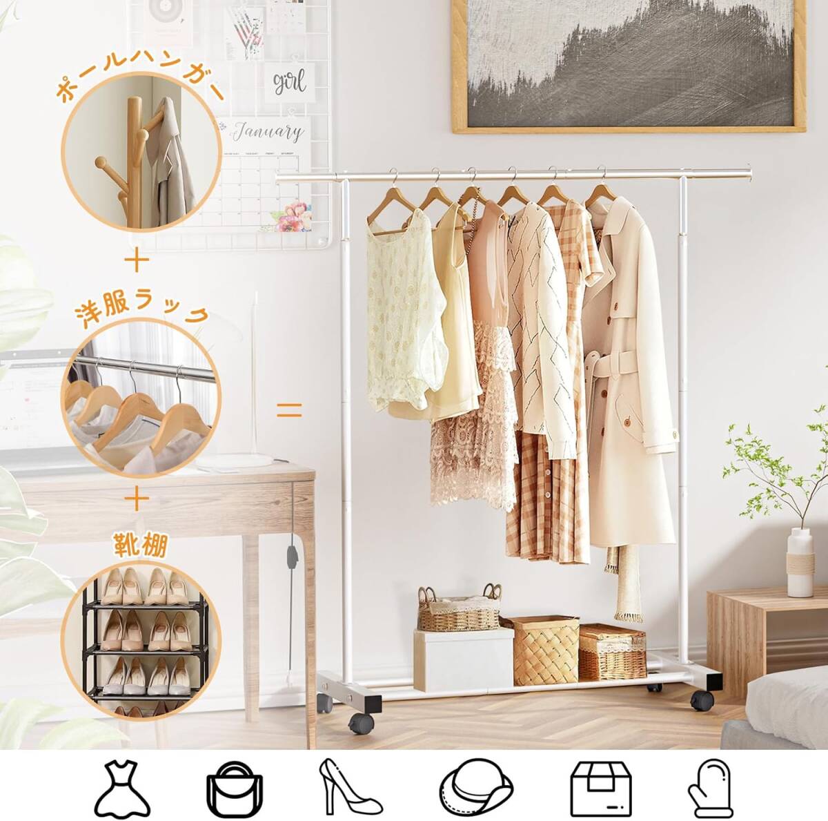 (ホワイト)ハンガーラック 室内物干しポールハンガー スチールラック キャスター付き 幅141×奥行36.5×高さ126.5cm