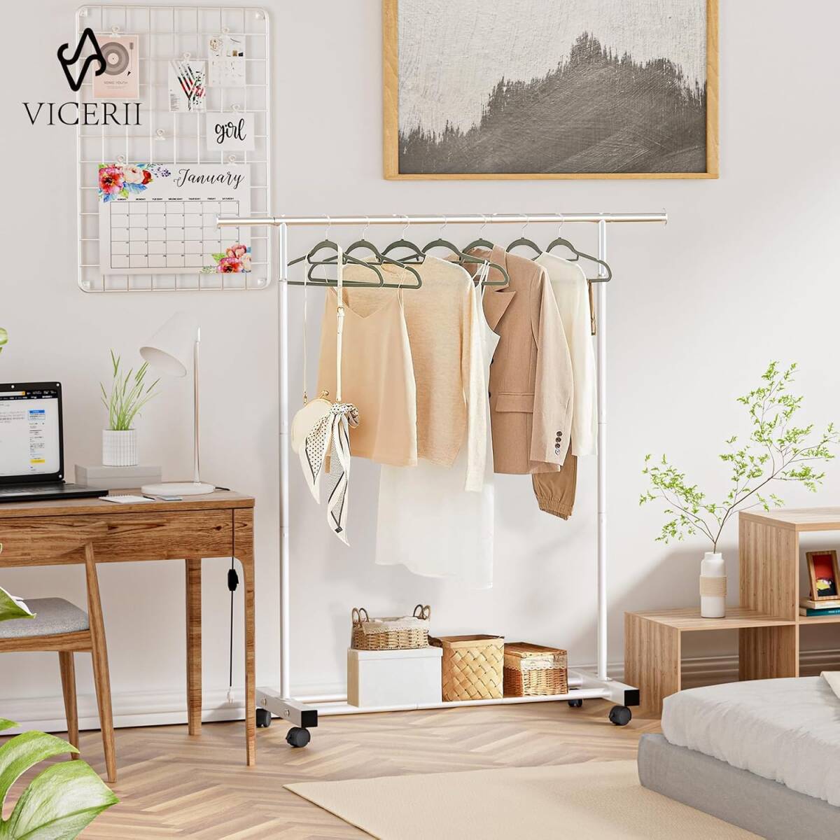 VICERII ハンガーラック おしゃれ シングルハンガーラック 室内物干し 頑丈 洋服収納 ポールハンガー スチールラック 洋服掛け キャスター付き 組立簡単 幅141×奥行36.5×高さ126.5cm 耐荷重45㎏ (ホワイト)