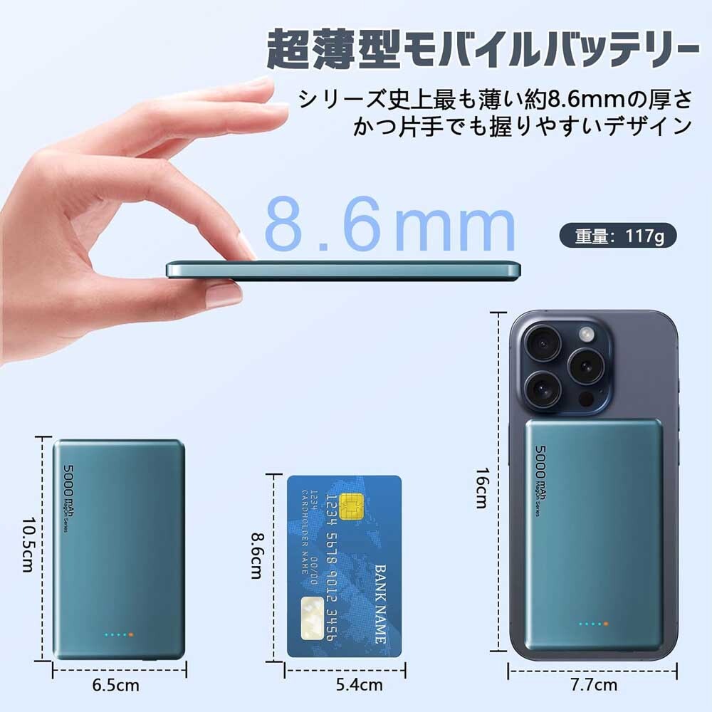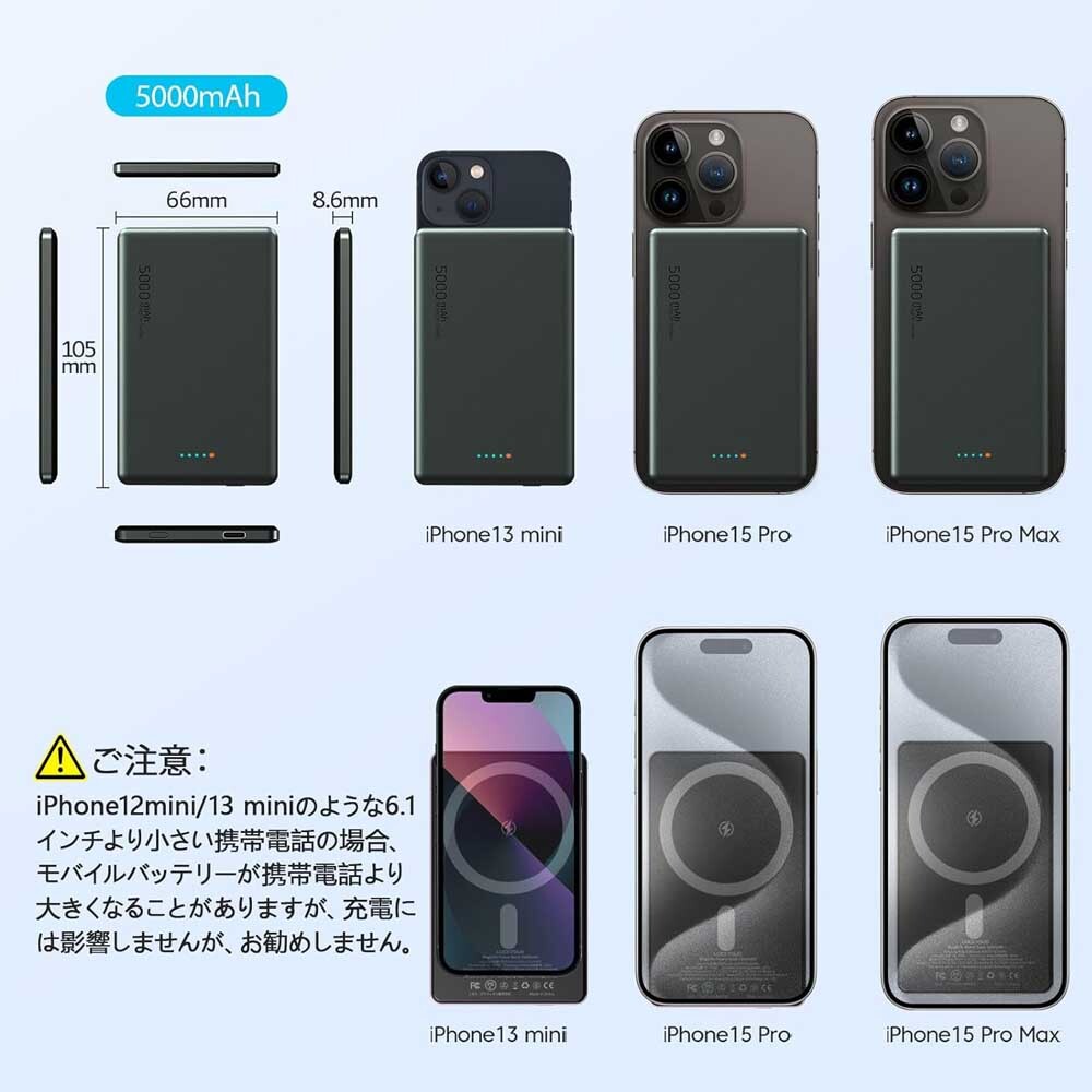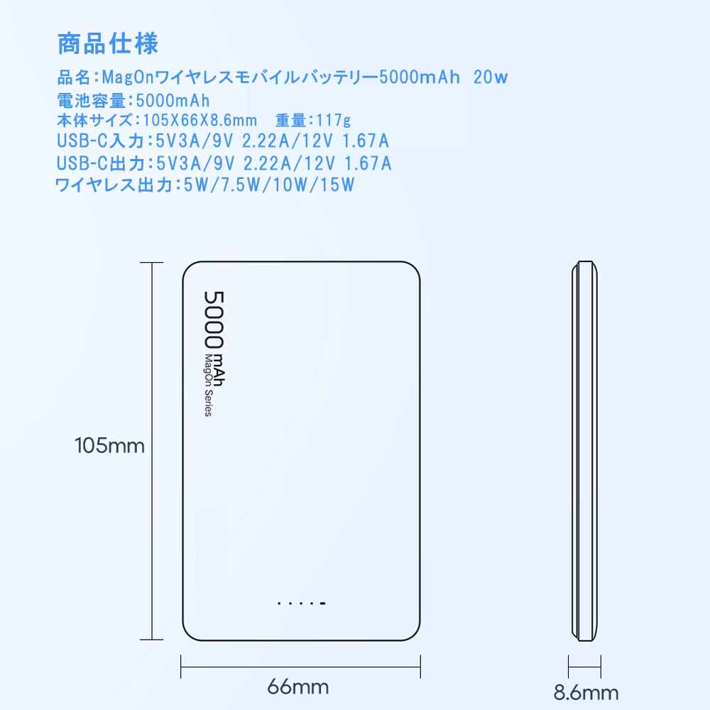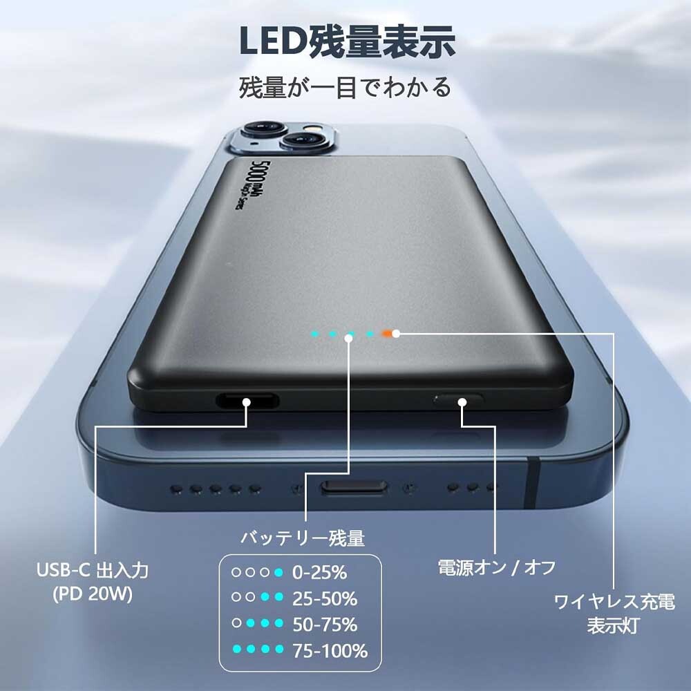 | Magsafe 対応 モバイルバッテリー 軽量 8.6MM薄型 マグネット式ワイヤレス充電 5000mAh PD20W USB-c出力 モバイルバッテリー ワイヤレス出力(15W for Android/7.5W for iPhone)/USB-Cポート入出力/PSE認証済み LED残量表示 | |