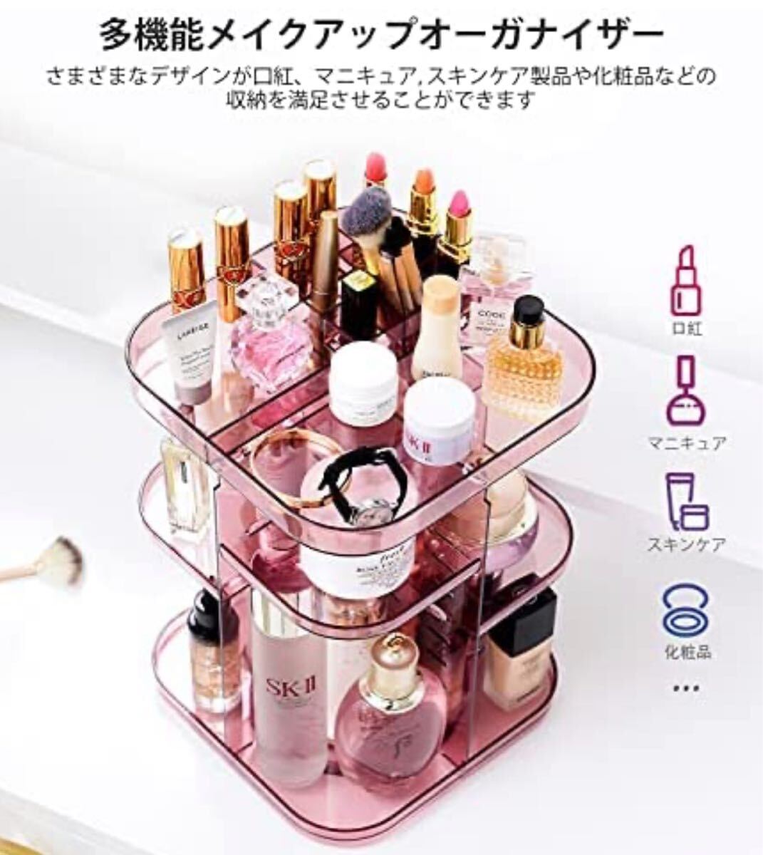 高品質メイクオーガナイザー - この化粧品収納ボックスは、透明度が非常に高い高品質のアクリル素材で作られています。触ると非常に滑らかで快適な表面です。スタイリッシュでエレガントな特別なクリスタルの光沢のある外観.さまざまなメイクを収納できるだけでなく、家にちょっとした装飾品を提供することもできます。多機能収納リボルビングメイクアップオーガナイザーは、ご家族や恋人へのプレゼントにも最適です。
