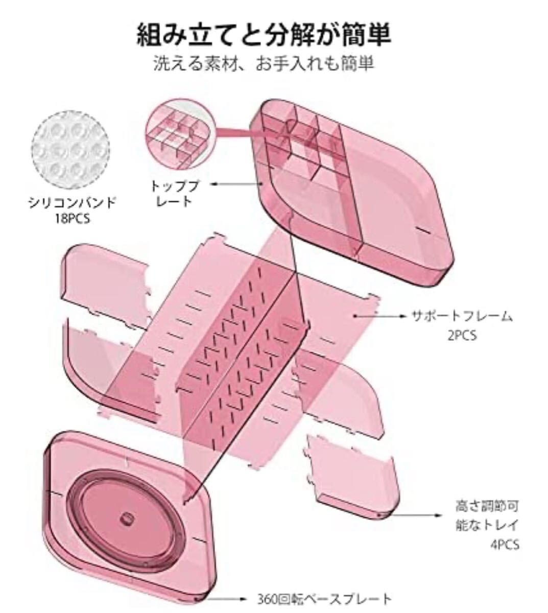 *簡単な取り付けで洗える - この化粧箱は、ユーザーマニュアルに従って取り付けと分解が簡単です。メイクアップオーガナイザーをDIYし、ラミネートの高さを好きなように調整します。2つのパーティション、1つのトッププレート、1つのベースプレート、4つのトレイ、18のシリコンリングを含むさまざまな取り外し可能なパーツで構成されています。取り外し可能なデザインと洗える素材でお手入れも簡単、洗ったり、湿らせた布で拭いたりすることもできます.
