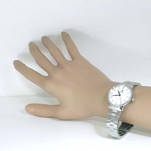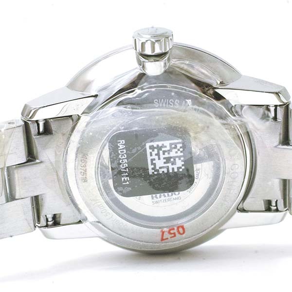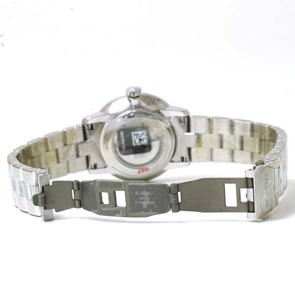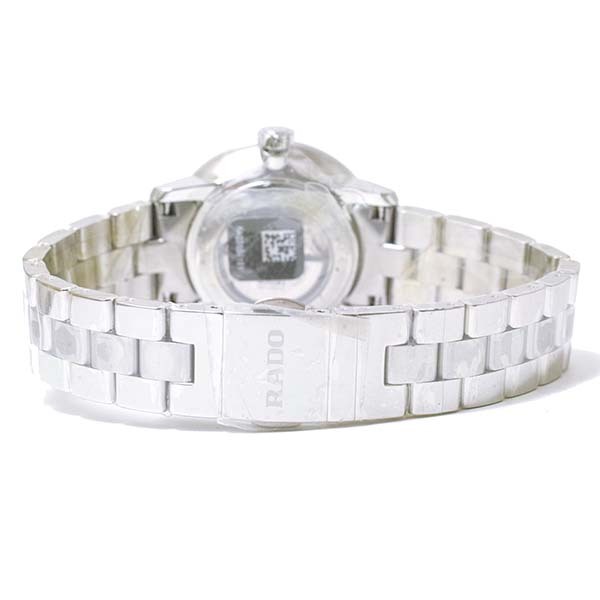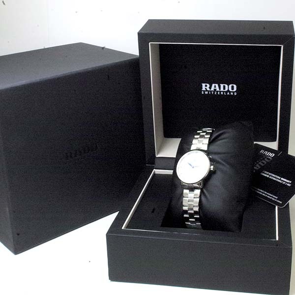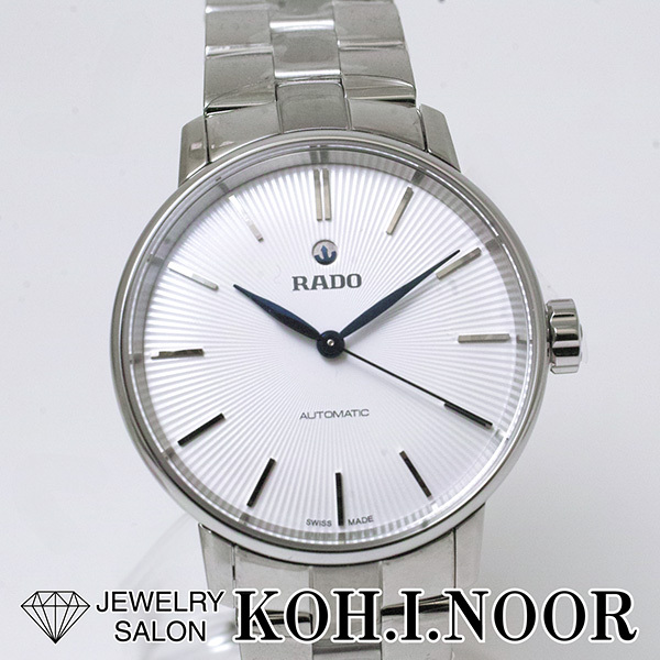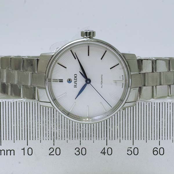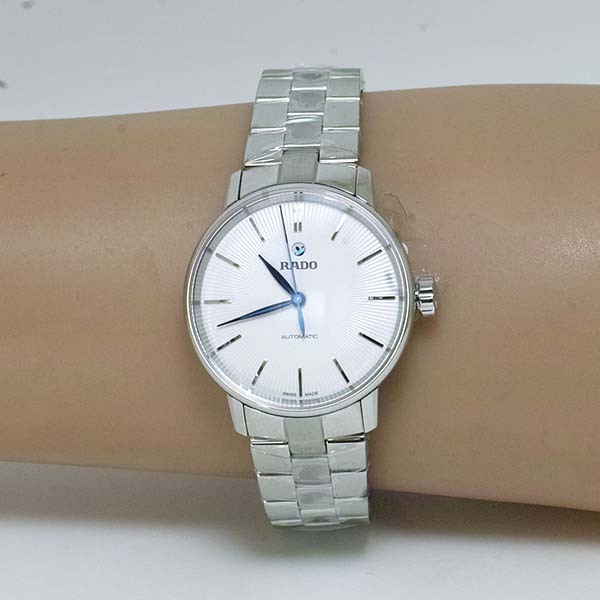 白文字盤にブルーの指針が爽やかなラドーの自動巻レディースウォッチ、クポール クラシック オートマティック。