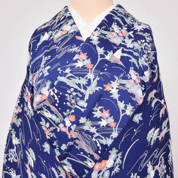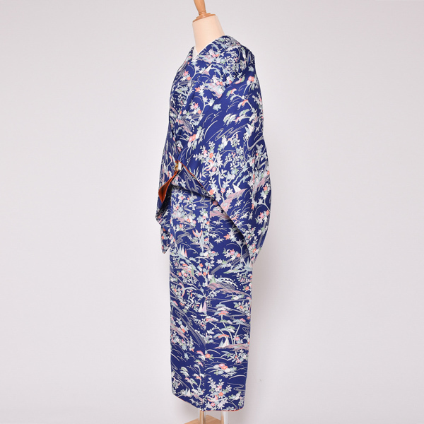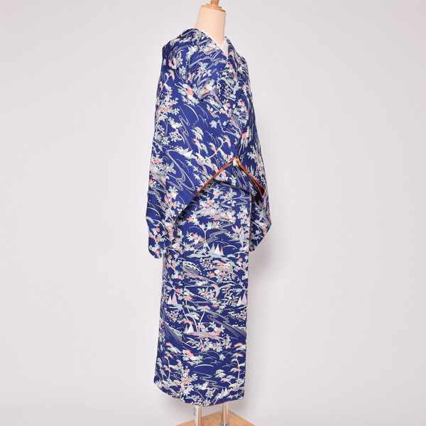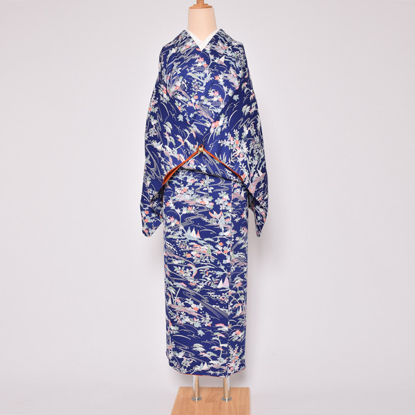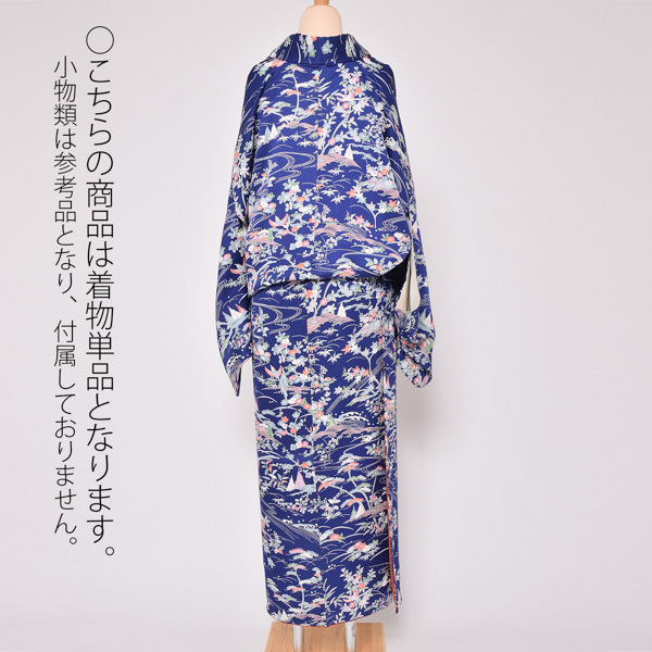 (Prices down3)(中古品)仕立て上がり 袷着物 「紺色 草花風景」 小紋 正絹 (メール便不可)<T>