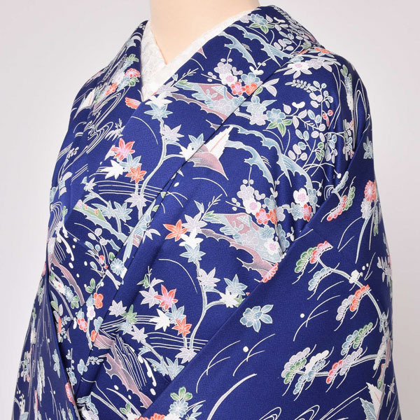 【中古品】仕立て上がり 袷着物 「紺色 草花風景」 小紋 正絹 【メール便不可】