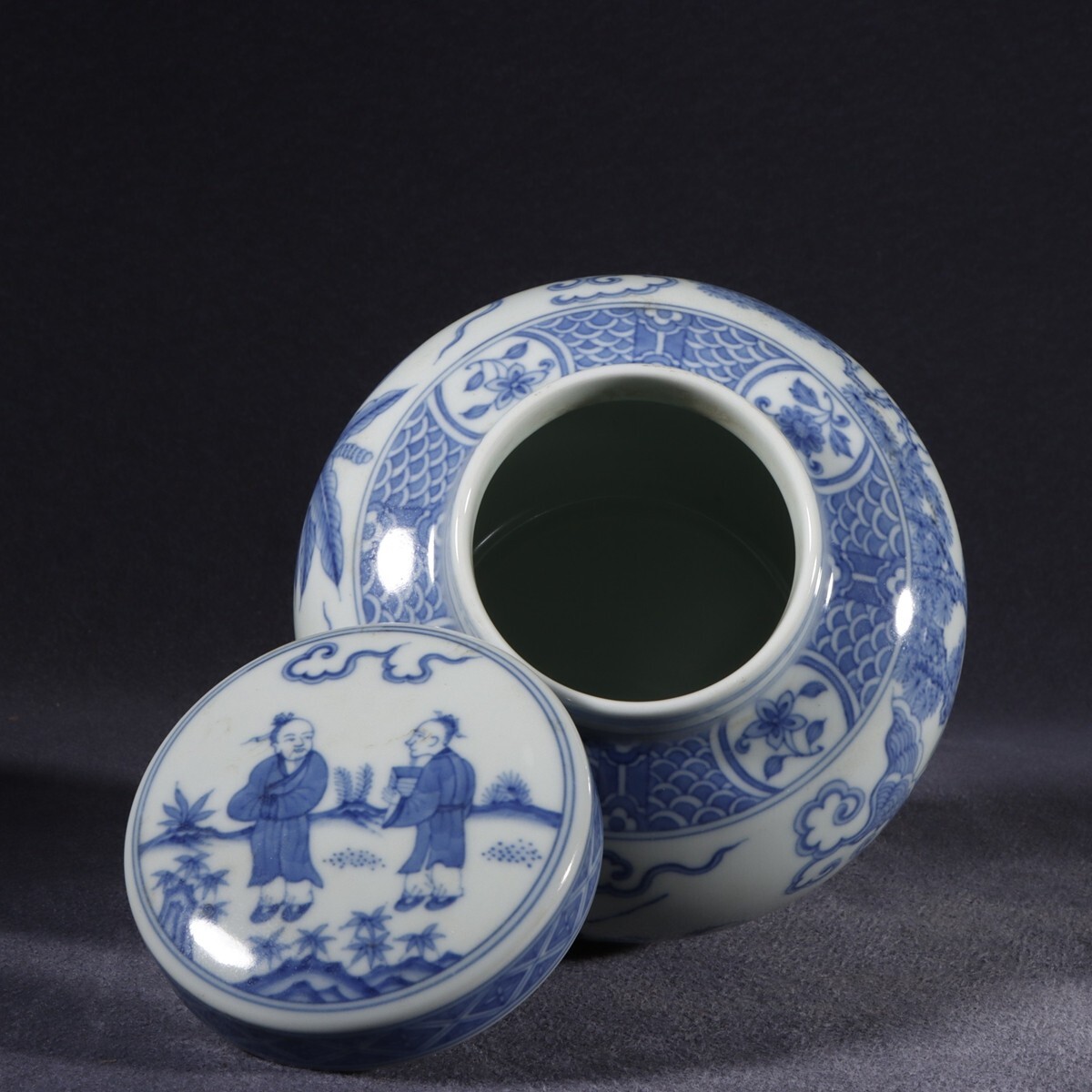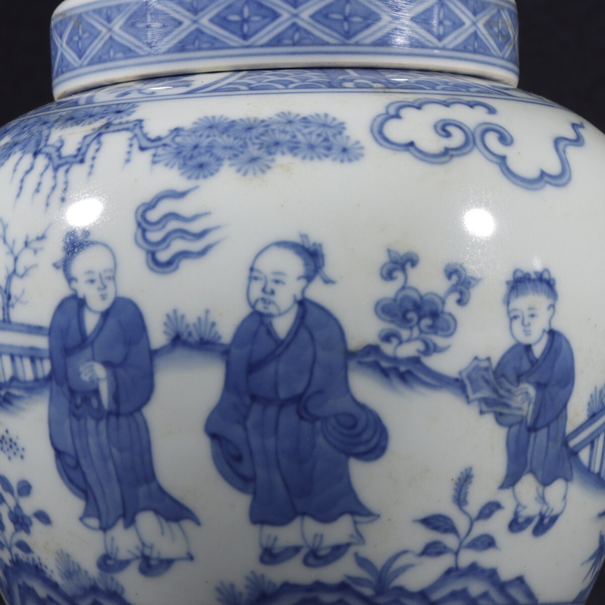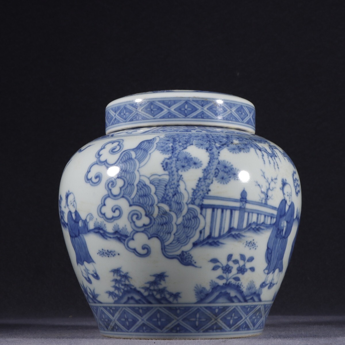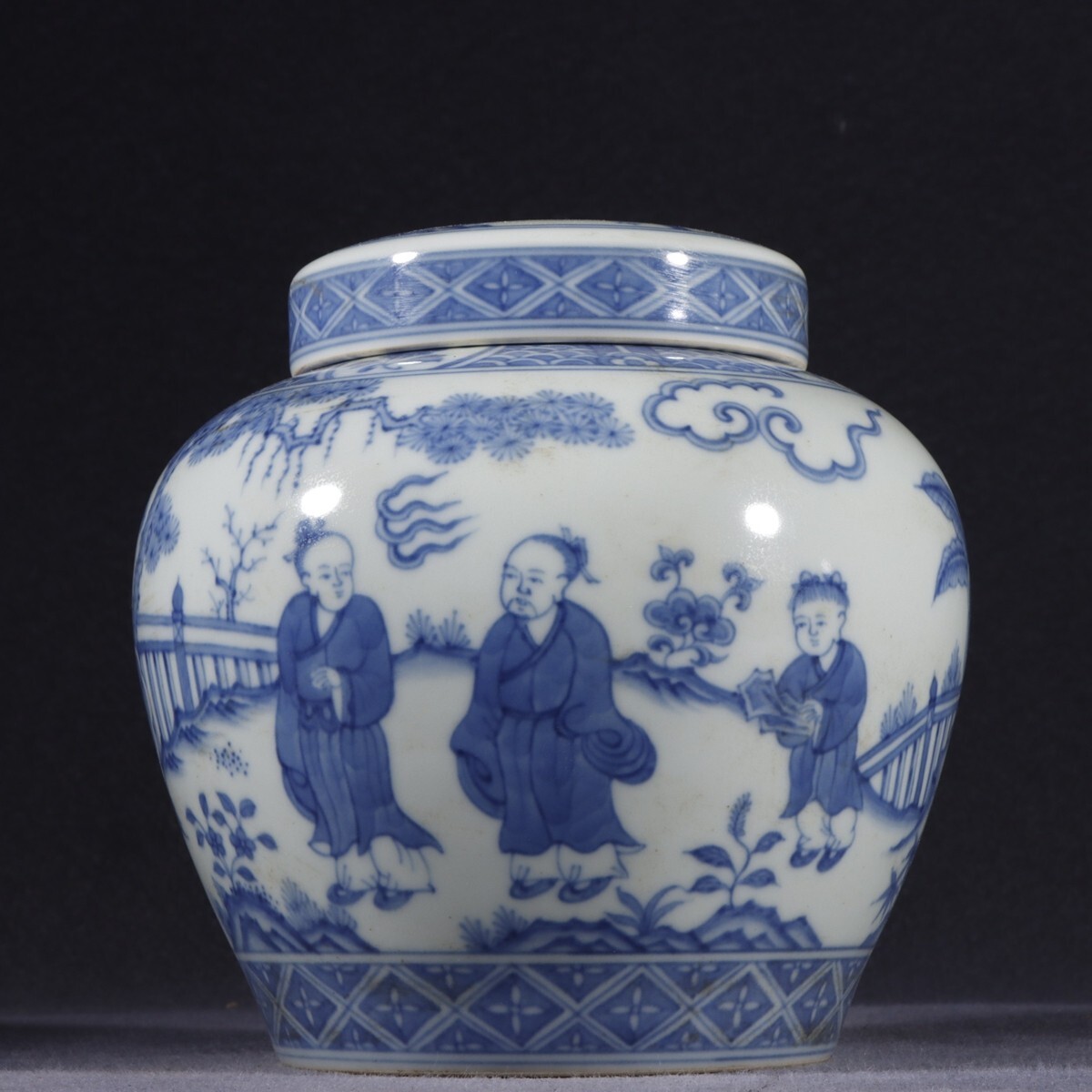 「明 成化年製 陶磁器 青花人物 天字罐」染付 置物 擺件 古賞物 中国古美術 旧蔵出