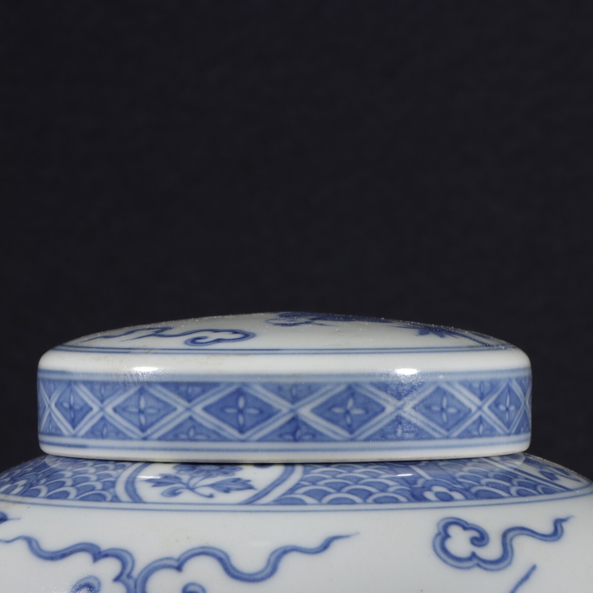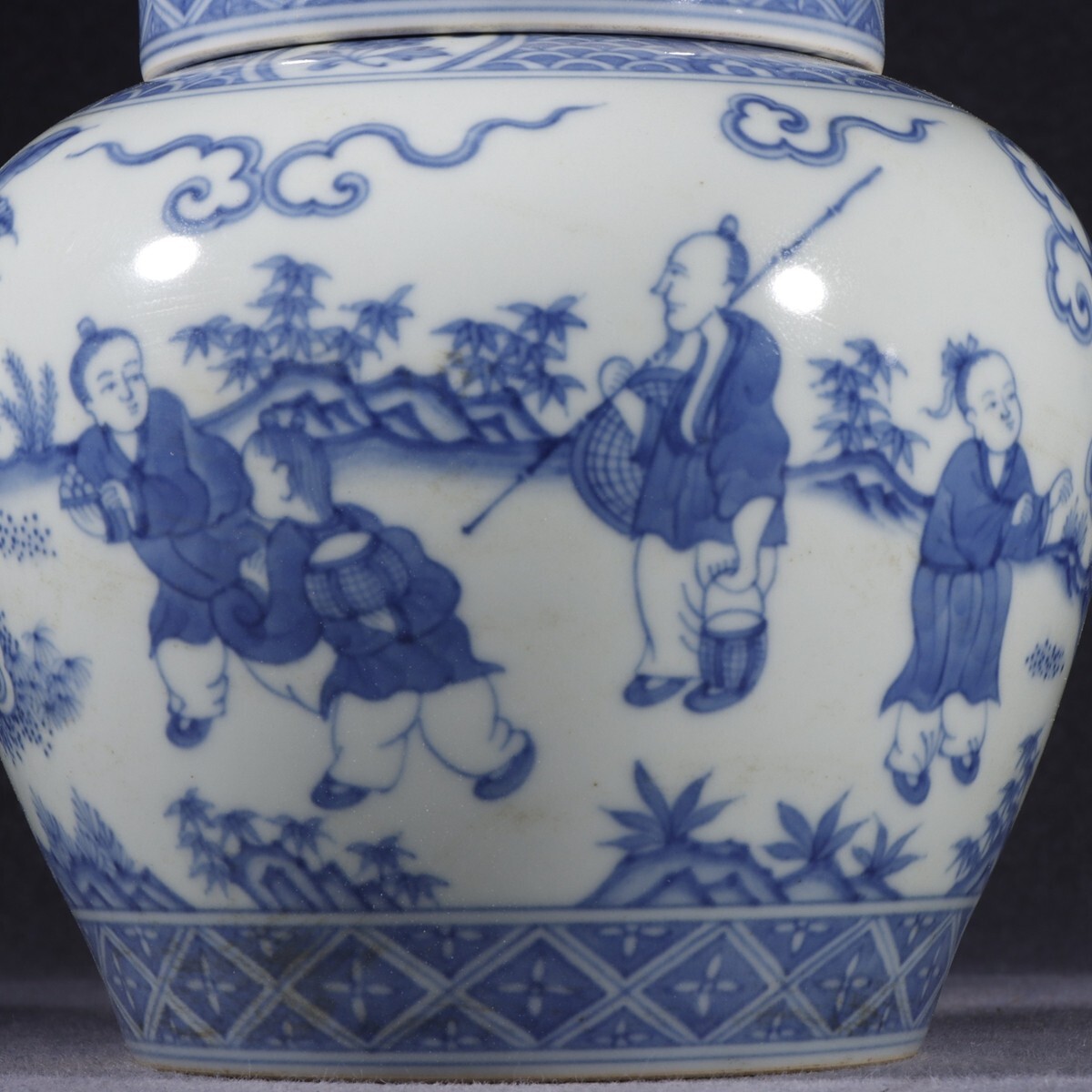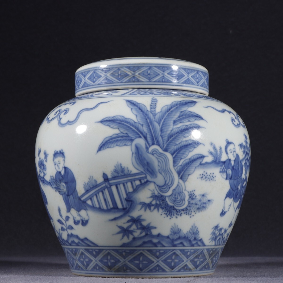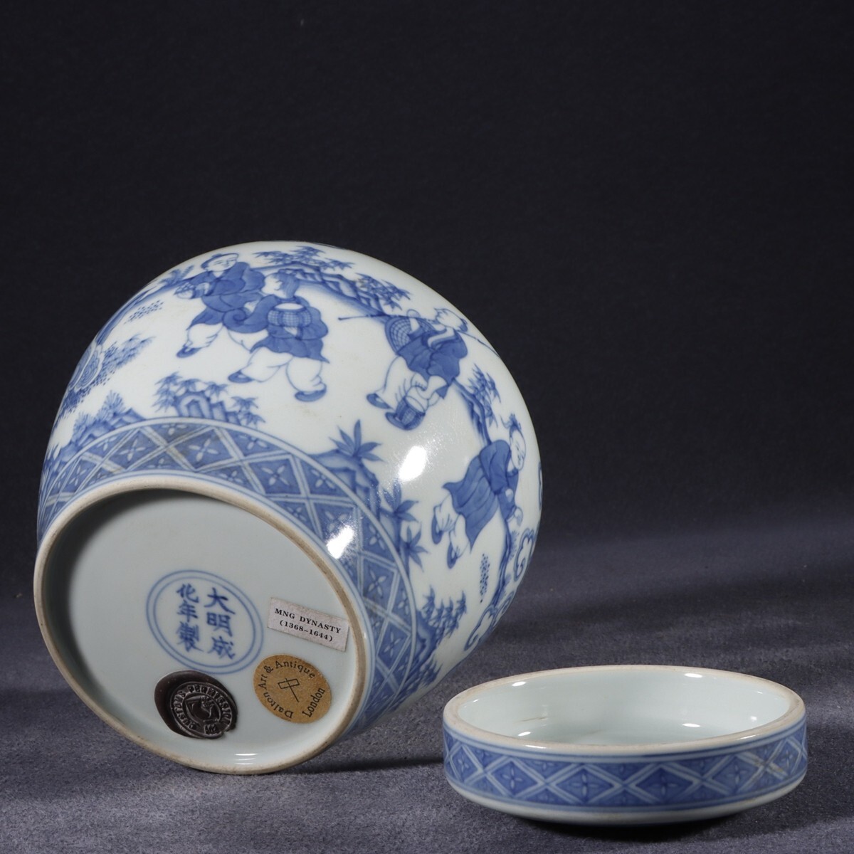 「明 成化年製 陶磁器 青花人物 天字罐」染付 置物 擺件 古賞物 中国古美術 旧蔵出