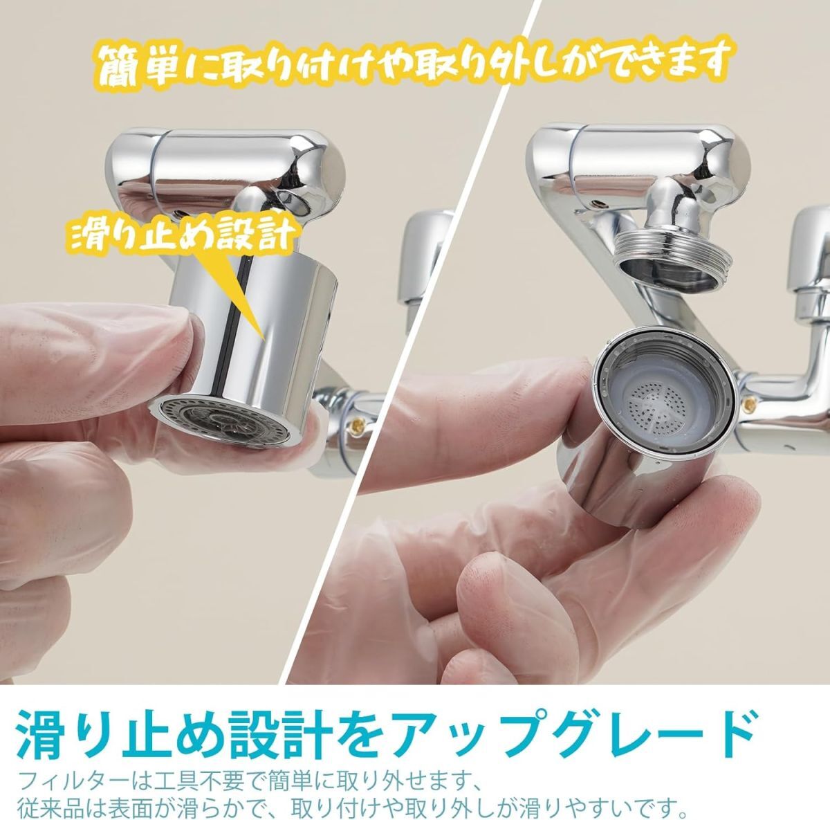 「2つのモード」従来の蛇口に取り付けられるだけで、吐水口のヘッドを回転させると、泡沫とシャワーモードを手軽に切り替えられます。
