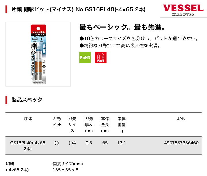 VESSEL 片頭 剛彩ビット(マイナス) No.GS16PL40(-4×65 2本)