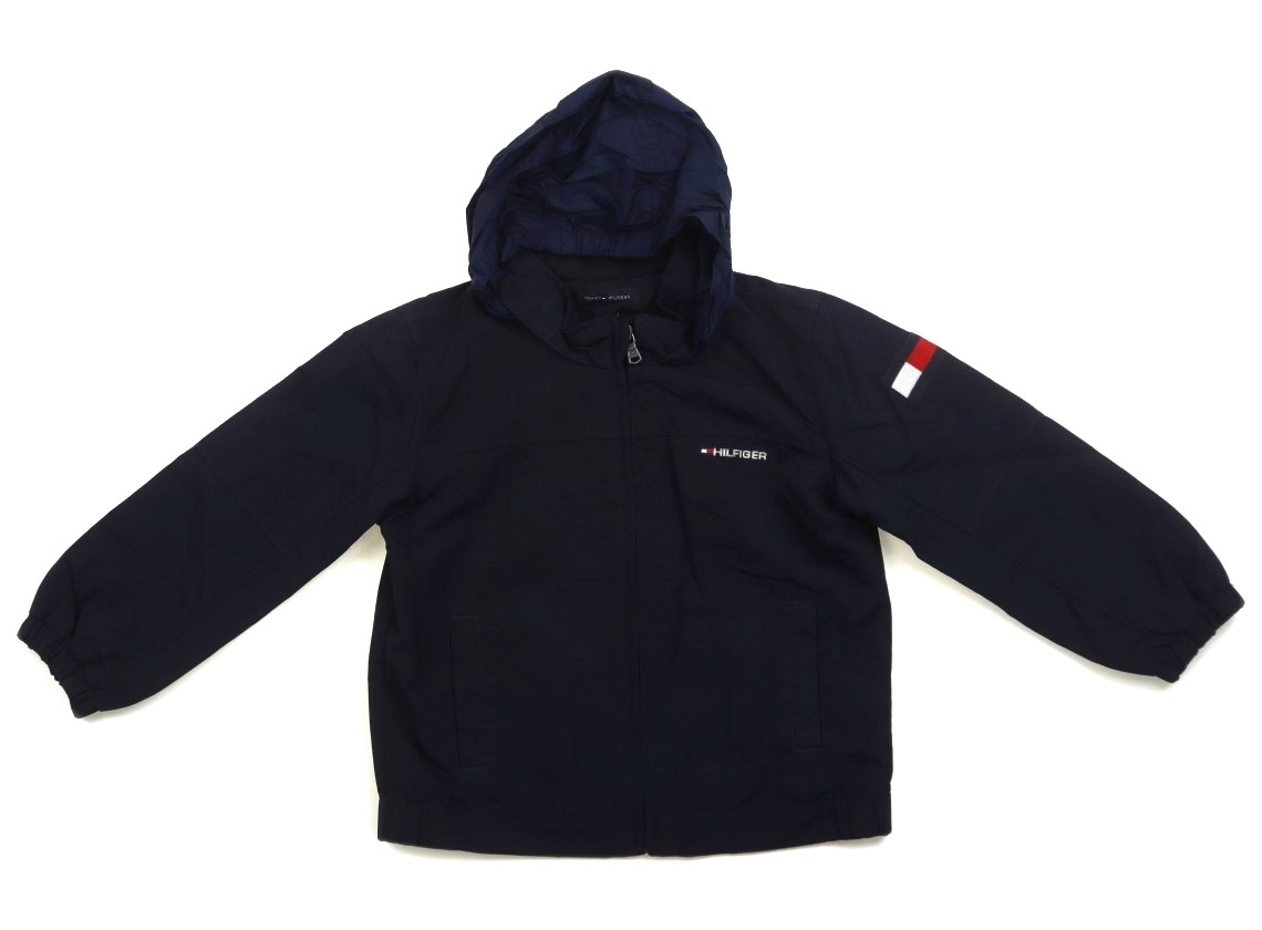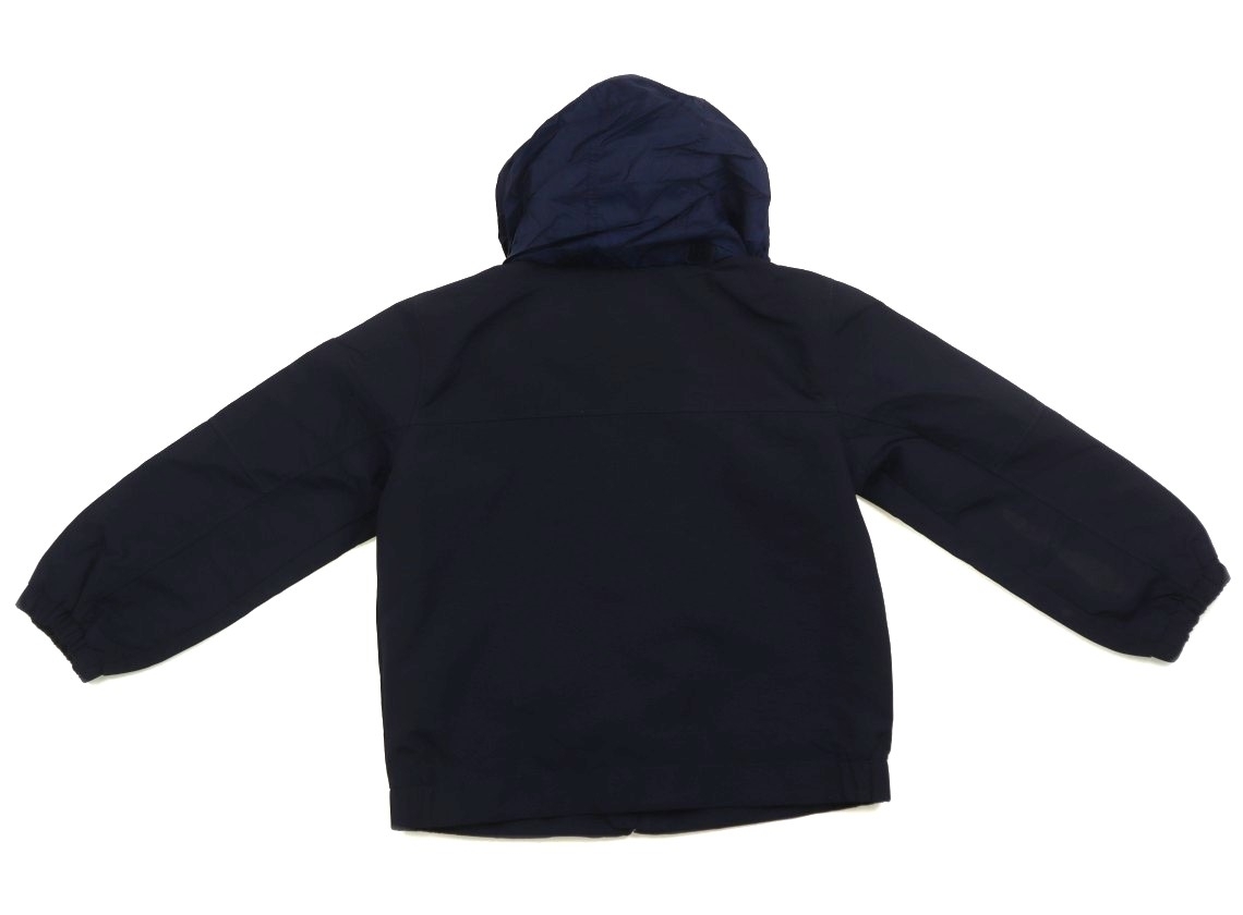 実際のサイズ表記は4T。ナイロン。メッシュ生地の裏地がついています。フードは折りたたんで収納可能です。ブランドタグにピンクのインク跡、右袖に横長に汚れが見られます。