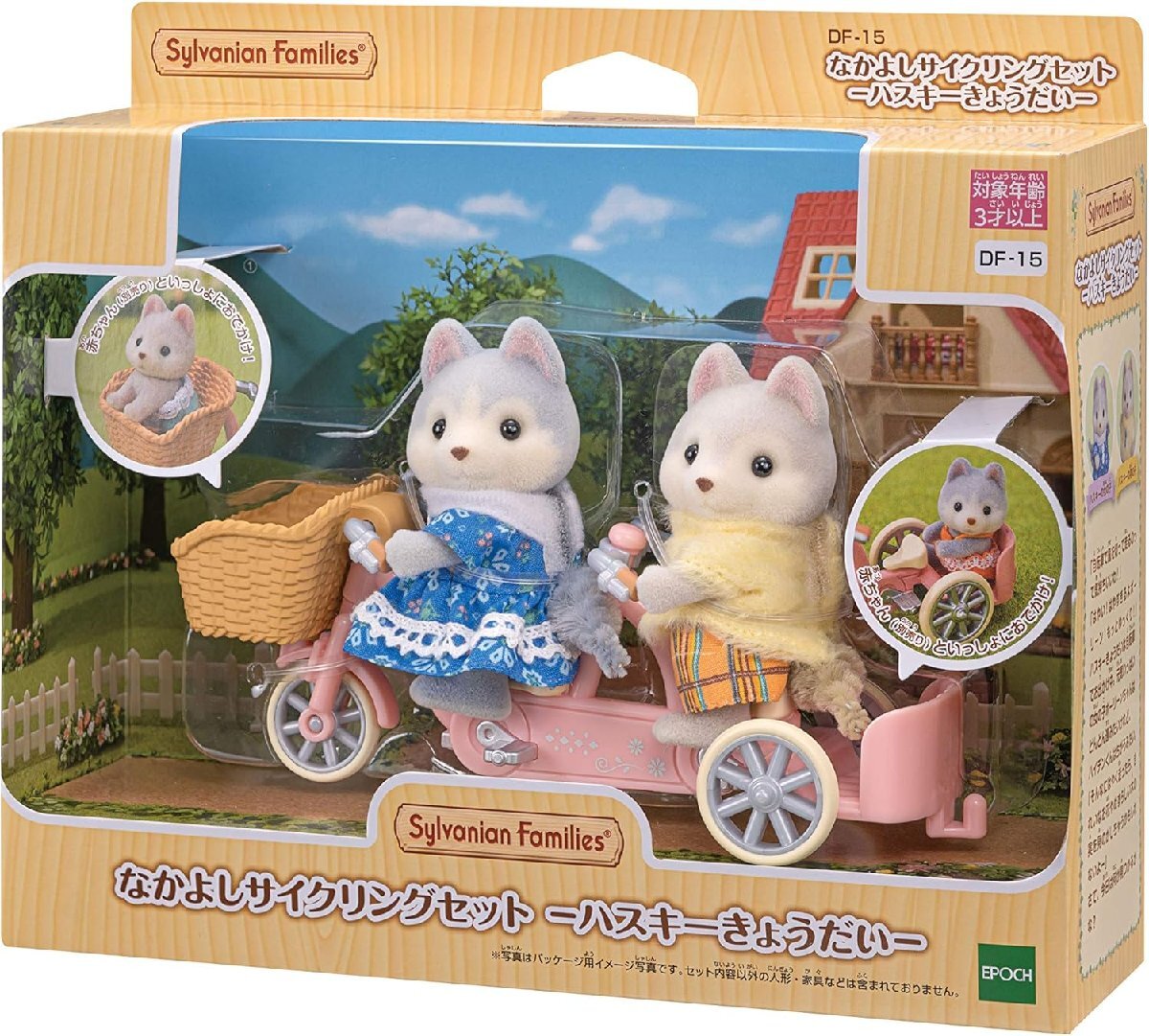 ハスキーの女の子と、男の子のお人形、ふたり乗り自転車のセットです。