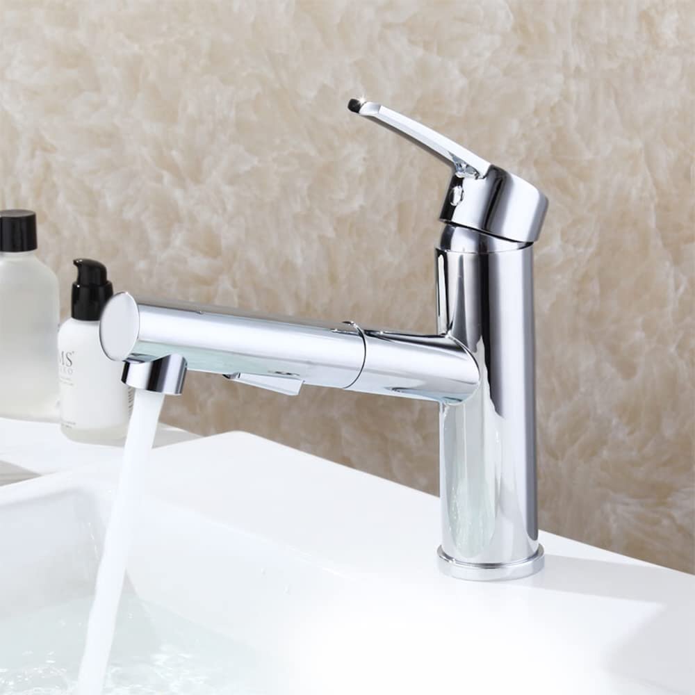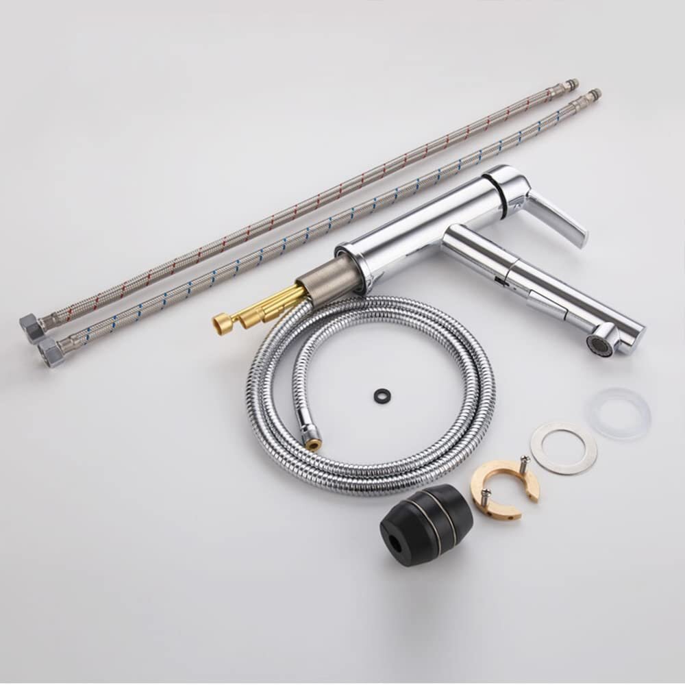 【洗面台用混合水栓】引き出し式蛇口は、コントロールレバーを上下に動かすだけで水抜きと水抜きを切り替えることができ、上下を左右に動かすことで温水と冷水を調整できます。希望の温度を自由に制御します。シャワーヘッドのスイッチボタンでシャワーと水流の調整を切り替えることができ、必要に応じて自由に調整できます