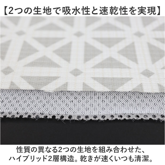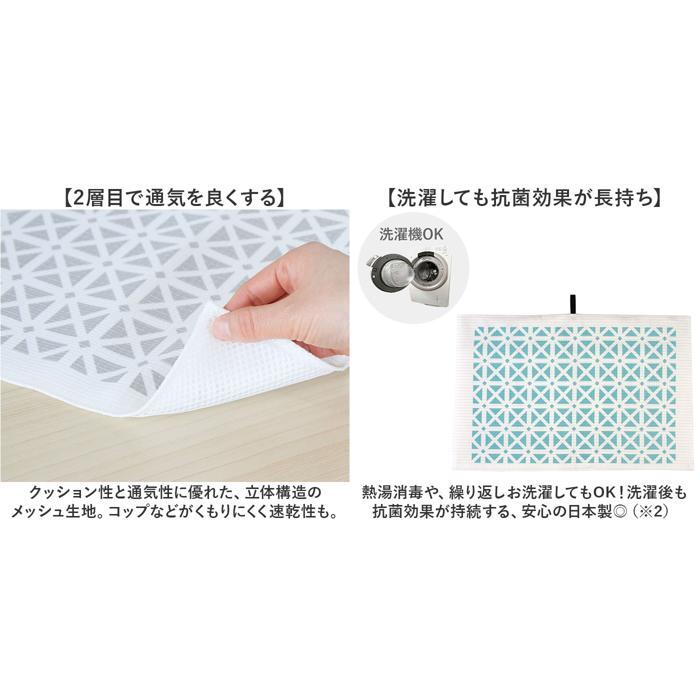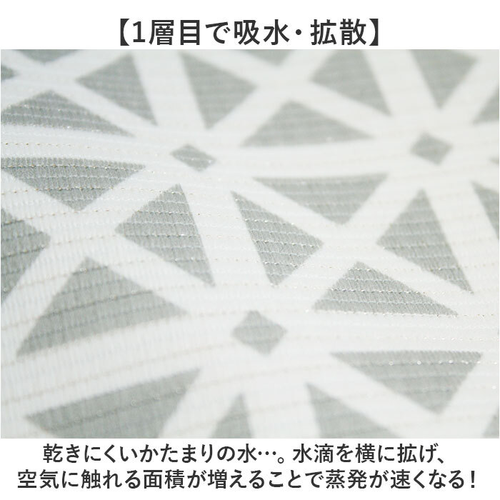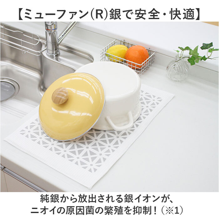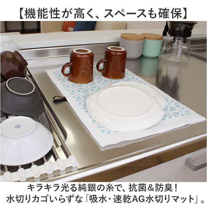 | 商品説明 | ・・【機能性が高く、スペースも確保】 ・キラキラ光る純銀の糸で、抗菌&防臭!水切りカゴいらずな「吸水・速乾AG水切りマット」。 ・【水切りカゴ不要でスペースを活用】 ・水切りカゴを使わず、洗った食器を乾燥。洗い物が多い時の予備用としても重宝。 ・【ミューファン(R)銀で安全・快適】 ・純銀から放出される銀イオンが、ニオイの原因菌の繁殖を抑制! ・(※1)ミューファン(R)は、純銀を真空着したフィルムを細い糸にしたものです。 ・【2つの生地で吸水性と速乾性を実現】 ・性質の異なる2つの生地を組み合わせた、ハイブリッド2層構造。乾きが速くいつも清潔。 ・【1層目で吸水・拡散】 ・乾きにくいかたまりの水…。水滴を横に拡げ、空気に触れる面積が増えることで蒸発が速くなる! ・【2層目で通気を良くする】 ・クッション性と通気性に優れた、立体構造のメッシュ生地。コップなどがくもりにくく速乾性も。 ・【洗濯しても抗菌効果が長持ち】 ・熱湯消毒や、繰り返しお洗濯してもOK!洗濯後も抗菌効果が持続する、安心の日本製◎ ・(※2)柔軟剤や柔軟剤入りの洗剤は、抗菌効果を低下させるため使用しないでください。 ・【使わない時は吊るせて衛生的】 ・使用後はループを使って、フックなどに掛けておけて便利。吊るして乾かせるのが嬉しい! |