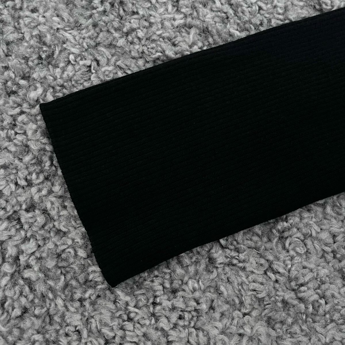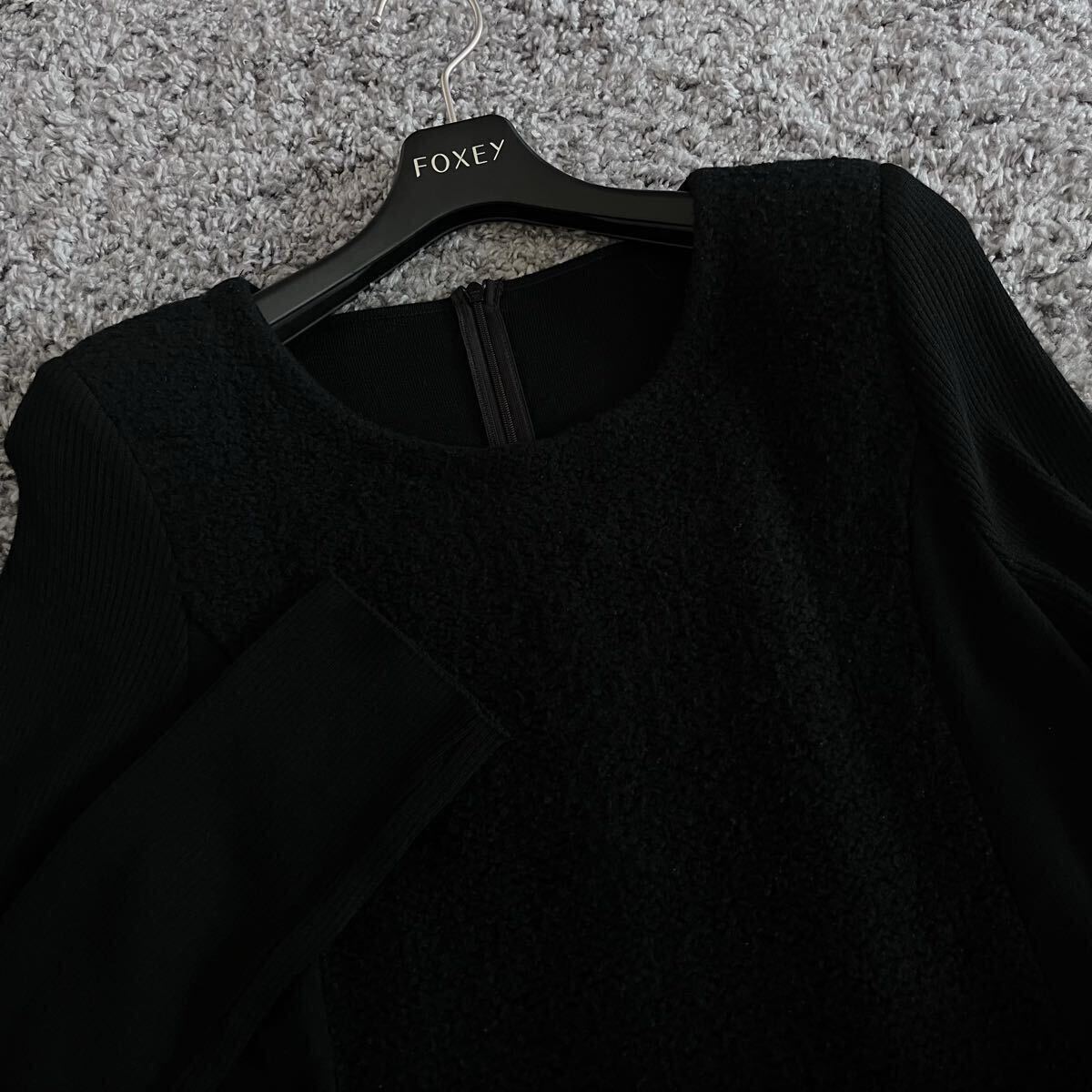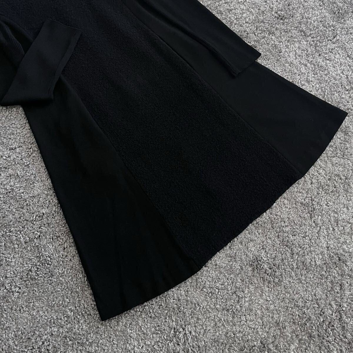 お色はブラック。フロントの中央はもこもことしたあたたかみのあるデザイン。袖はリブニット。バックファスナー。