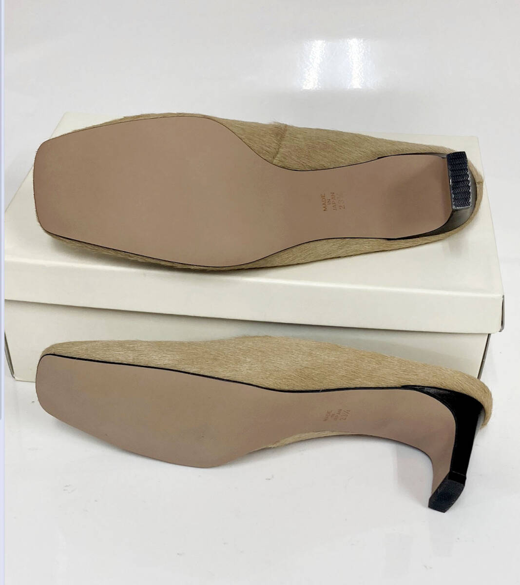 ベージュのハラコ素材を使用しながらも、派手すぎず落ち着いた雰囲気で、上品な印象を与えてくれる一足です。